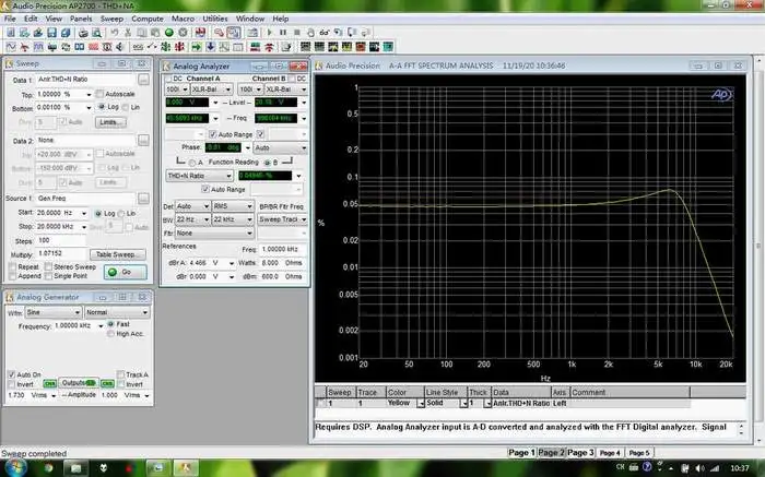 Вся машина работает в абсолютно отрицательном состоянии, без отзывы. Однако, как вы можете видеть на диаграмме ниже, уровень искажений от 20 Гц до 5 кГц остается довольно ровным и прямым, обеспечивая последовательный звук при воспроизведении различных инструментов.
