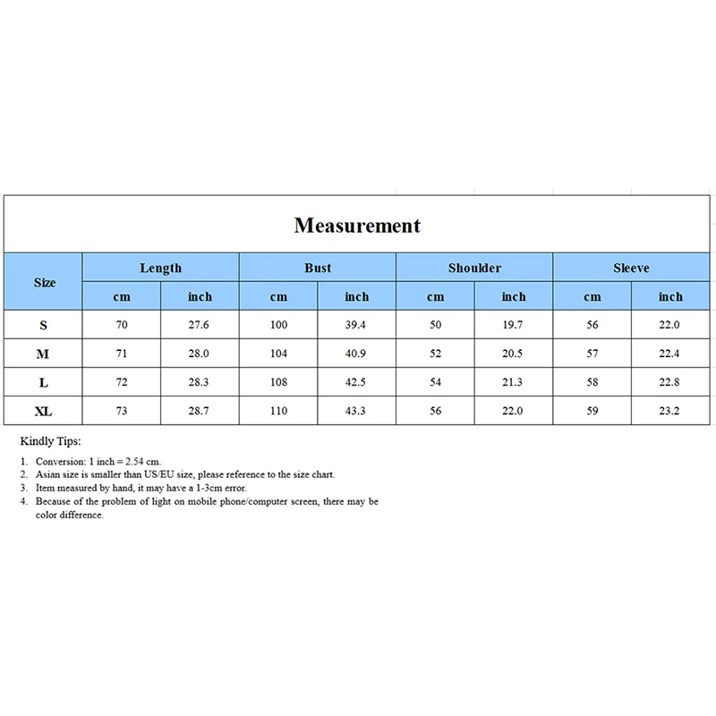 Длина Обхват груди Сумка на плечоРукаваS70 см100 см50 см56 смМ71 см 104 см 52 см 57 см L72 см 108 см54 см58 см XL73 см110 см 56 см 59 см 1. Напоминаем, что из-за световых эффектов, настроек яркости/контрастности монитора и т. Д. Цвет реального товара может немного отличаться от цвета товара на фотографии, представленной на веб-сайте. 2. Измерения вручную, могут отличаться на 1-3 см, мы будем очень признательны за понимание.