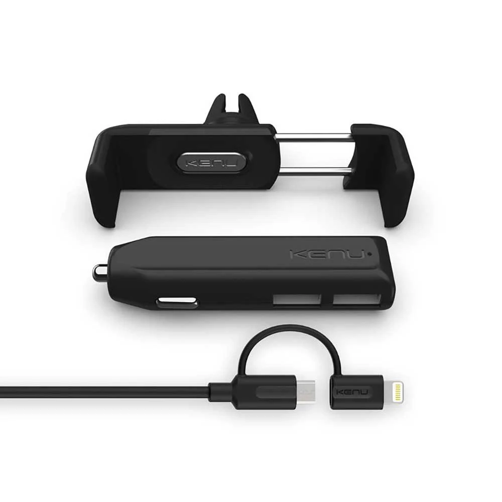 Комплект Kenu Airframe+ Car Kit Deluxe. Автомобильное зарядное устройство Kenu Dual Trip для мобильных устройств. В комплекте автомобильное пластиковое крепление Kenu Airframe+ и провод USB на Lightning.