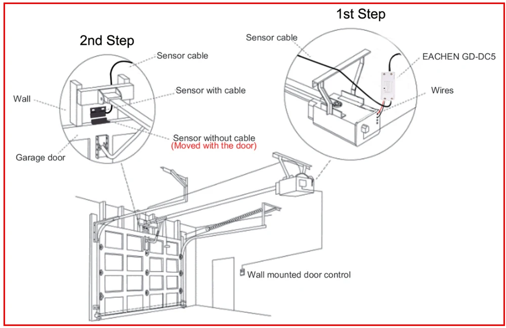 1. Дверь гаража будет активирована, когда она будет успешно добавлена (когда синий светодиодный светильник прекратит мигать), поэтому сначала закройте дверь.