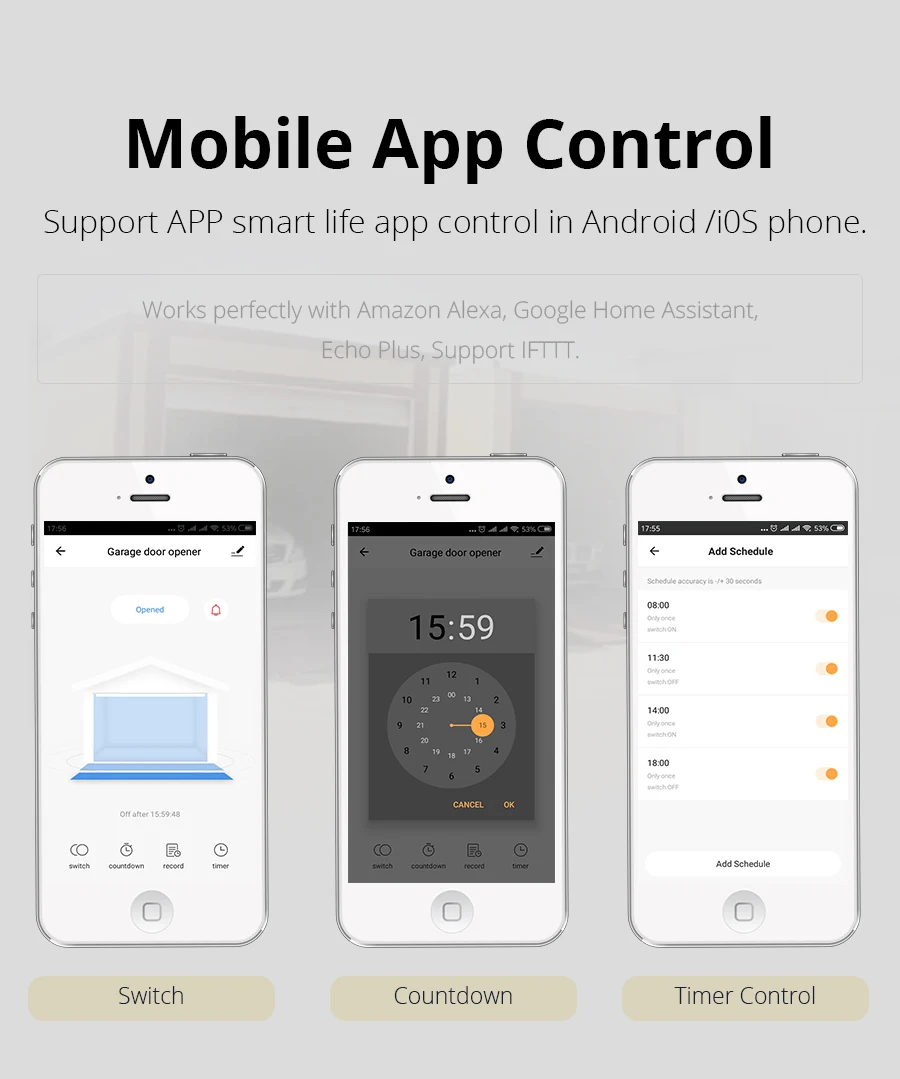 Функция таймера: вы можете установить расписание, чтобы открыть и закрыть дверь гаража. Быстрая и простая установка, а также без необходимости профессионала. Нет скрытого Пн