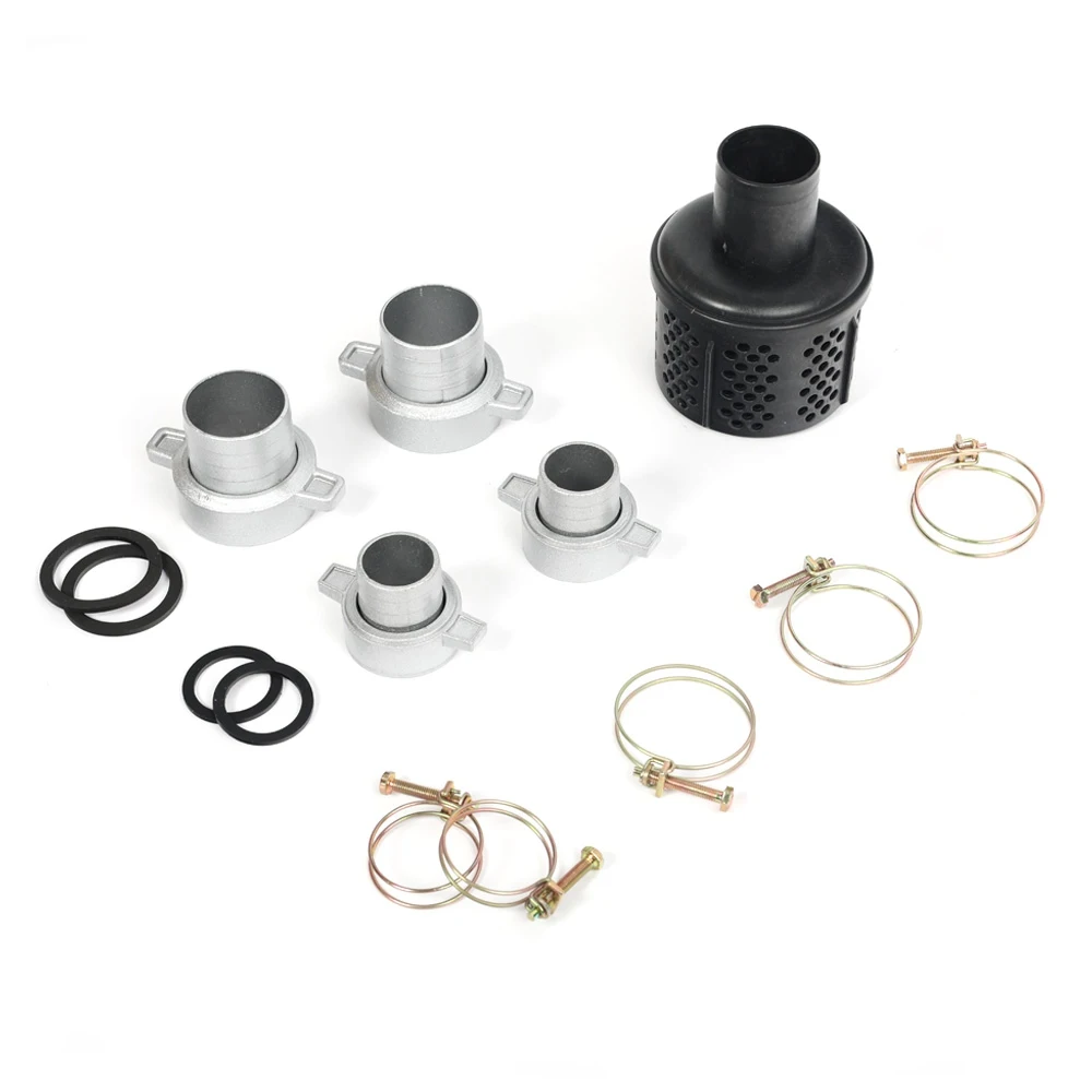 Комплект: переходники на всасывающий и подающий шланги, хомуты, сетка-фильтр на всасывающий шланг.