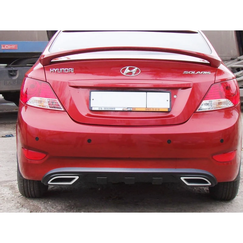 Накладка на задний бампер (диффузор) для Hyundai Solaris (Хюндай Хендай Хёндэ Солярис) 2010-2014 придает внешности автомобиля оригинальность и защищает бампер от повреждений при наезде на бордюр и другие дорожные неровности. Изготовлена из АБС-пластика. Поверхность глянцевая, с тиснением.