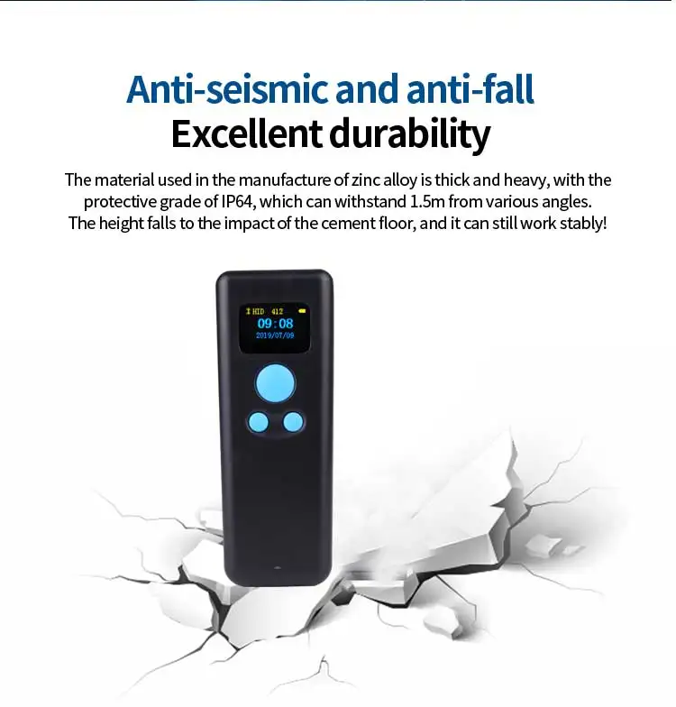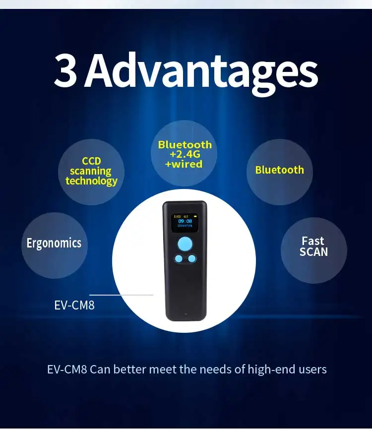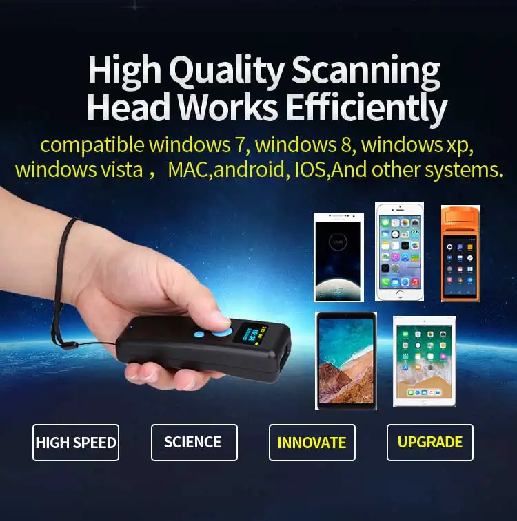 Особенности: 1. Bluetooth + 2,4G + проводной Три режима. 2. Мини-размер, светильник и портативный. Маленький размер легко держать в руках. 3. Беспроводная передача на расстоянии обзора 50 м. 4. Хранение: 4 Мб 5. Поддержка нескольких языков клавиатуры. 6. Поддерживает режим HID/SPP/BLE и может переключаться. 7. Идеально поддерживает различные версии Windows, iOS, Android OS. 8. Работает с поддержкой bluetooth КПК, смартфонов, планшетов, ноутбуков и настольных компьютеров. 9. Применение: супермаркет, розничная торговля, склад, логистика, библиотека, табак, медицина и т. Д. 10. Может быть настроен в соответствии с требованиями заказчика.