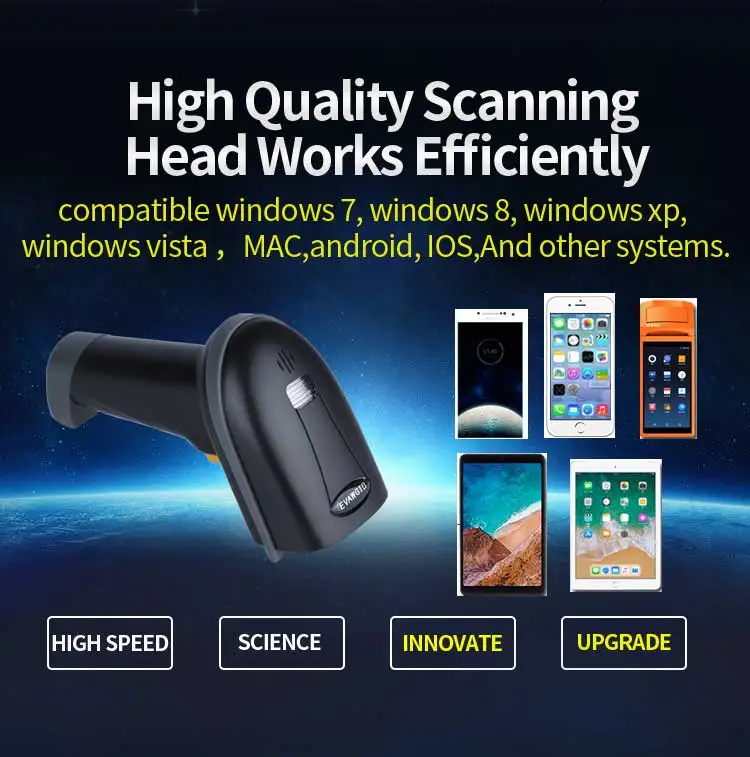 Особенности: 1. Быстро определить бумажный 1D штрих-код 2. Plug & Play дизайн, не нужен драйвер 3. Автоматическое распознавание и непрерывное сканирование 4. Внешний вид с эргономичным дизайном 5. Долгое время работы с емкостью аккумулятора 1200 мАч 6. Совместимость с различными системами 7. Варианты Применения: Супермаркеты/кассы магазинов, столы обслуживания клиентов, билетные окна.
