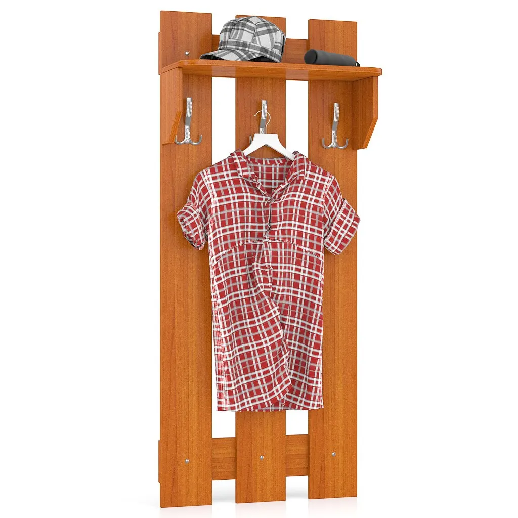 Вешалка оборудована тремя большими двойными крючками для одежды и антресольной полочкой для головных уборов.