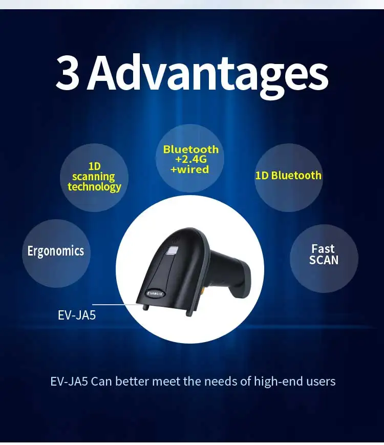 * Bluetooth/проводной/2,4G три режима. * Мини-размер, светильник и портативный. * Беспроводная передача на расстоянии обзора 50 м. * Хранение: 40000 штрих-кодов. * Поддержка нескольких языков клавиатуры. * Поддерживает режим HID/SPP и может переключаться. * Идеально поддерживает различные версии Windows, iOS, Android OS,Mac. * Работает с поддержкой bluetooth PDAs, смартфонами, планшетами, ноутбуками и настольным компьютером. * Может быть настроен в соответствии с требованиями заказчика. * Быстро Определите штрих-код бумаги 1D. * Конструкция Plug & Play, не требует драйвера. * Автоматическое распознавание и непрерывное сканирование. * Внешний вид с эргономичным дизайном. * Долгое время работы с емкостью аккумулятора 1200 мАч.