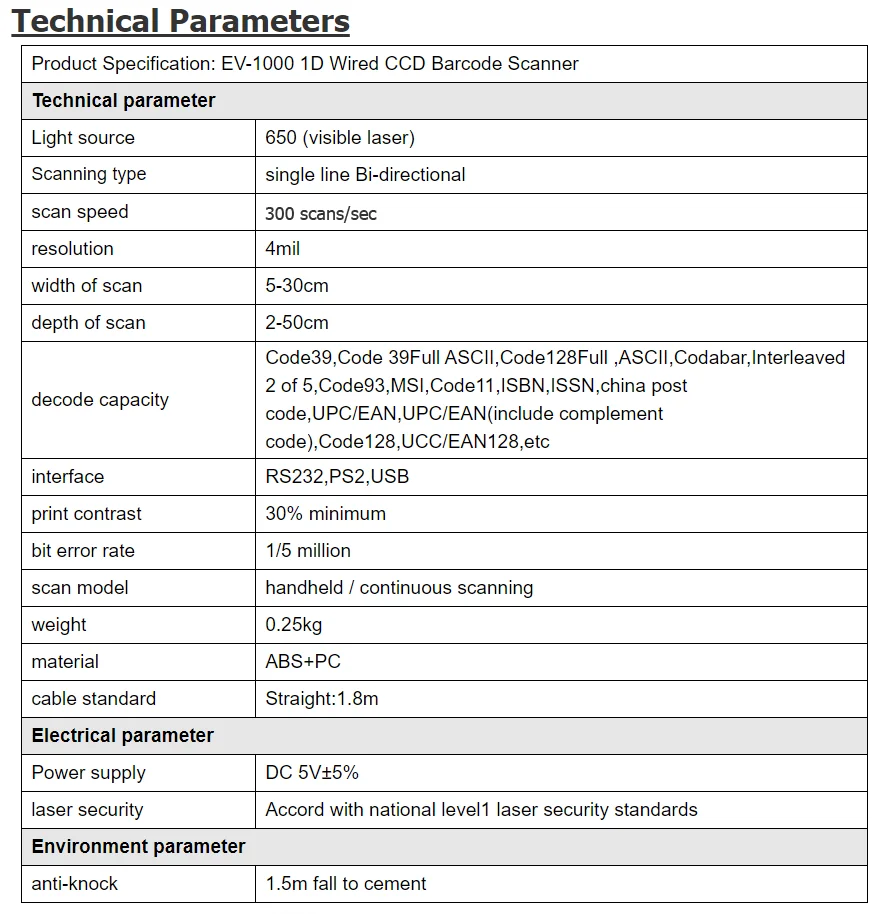 1. Разрешение ≥ 4 мил 2. Интерфейс передачи данных: USB 3. Внешний размер: 16,4 × 6,3 × 9,2 см 4. Вес (без кабеля): 150 г 5. Емкость декодирования: Code39, полный код 39 ASCII,Code128Full,ASCII,Codabar,Interleaved 2 из 5,Code93,MSI,Code11,ISBN,ISSN, Китай Почтовый индекс, UPC/EAN,UPC/EAN (включая Дополнительный код),Code128,UCC/EAN128 и т. Д. 6. Посылка Вес: 0,3 кг 7. Посылка Размер: 17,3 × 11,2 × 7,3 см
