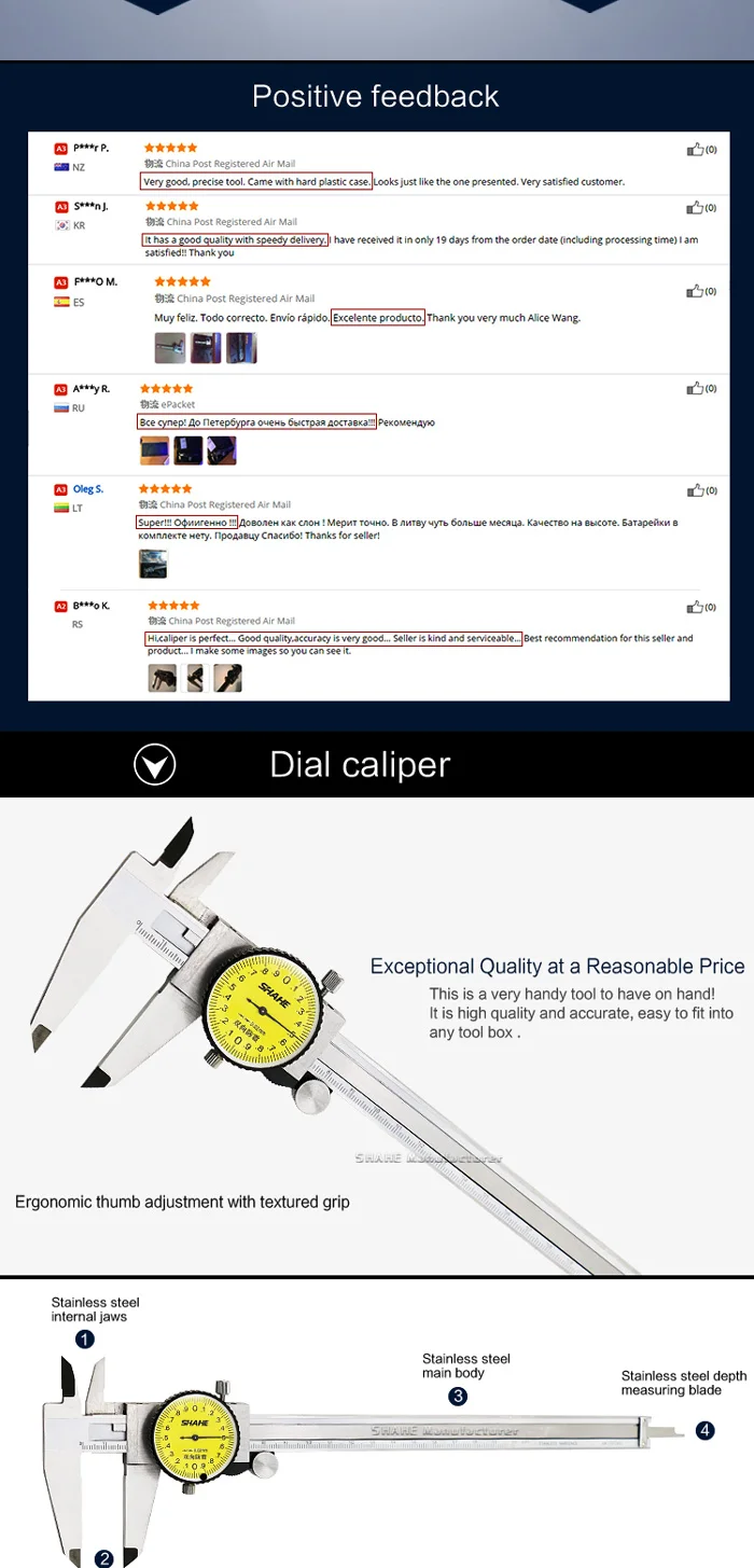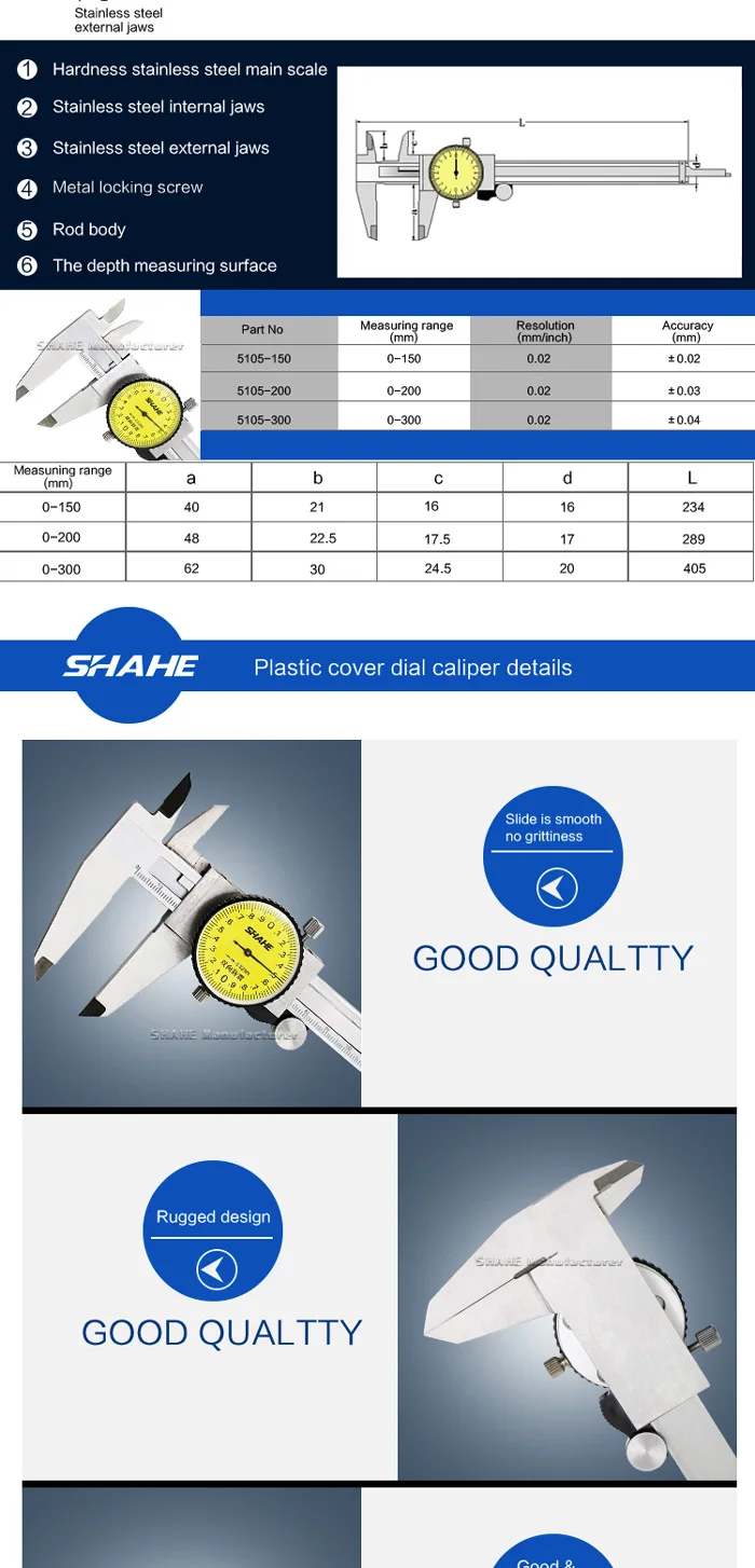 1. Четыре функции измерения внутреннего диаметра, внешнего диаметра, глубины и шага. 2. Изготовлен из нержавеющей стали, имеет антикоррозийные свойства 3. Индикатор двунаправленного землетрясения 4. Металлический корпус защищает от утюга 5. Поворотный циферблат zero, затем Блокировка