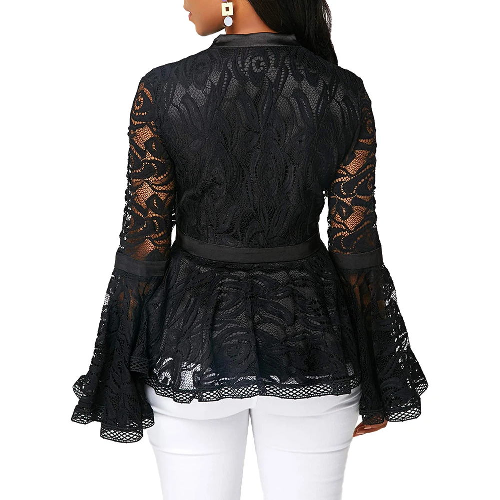 Плюс Размер Женская длинная расклешенная рукав пуговицы Талия плотная кружевная простроченная блузка