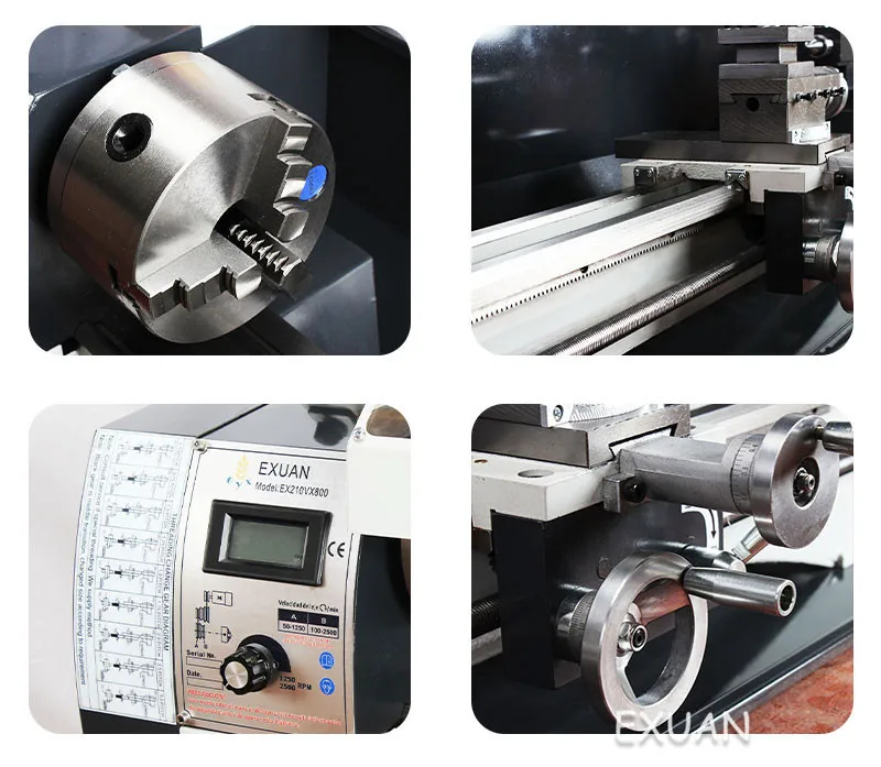 Название продукта: Настольный Токарный Станок Модель: EX210V/EX210VX800 Напряжение: 220V50HZ Бесщеточный двигатель 750 Вт: эквивалент 1000 Вт с щеткой Сквозное отверстие шпинделя: 38 мм Скорость вращения шпинделя: 50-2500 об/мин Количество сдвигов: непрерывная переменная Диапазон точности машины:<10s Поворотный диаметр стойки инструмента: 100 мм Диаметр точения кровати: 180 мм Расстояние между двумя наконечниками: 400 мм/800 мм Коническое отверстие шпинделя: Morse 3 Конус хвостового вала: Морзе 2 Максимальная сила зажима патрона: 120 мм 125 патрон Почтовая станция инструмента: четыре станции Максимальный ход стойки инструмента: 55 мм Средний ход лотка: 75 мм Большой ход поддона: 276 мм Длина рукава: 60 мм Диапазон автоматической подачи: 0,1-0,2 мм Длина токарного станка: 1200 мм Ширина токарного станка: 390 мм Высота токарного станка: 370 мм Вес брутто токарного станка: 90 кг Патрон: трехкулачковый патрон