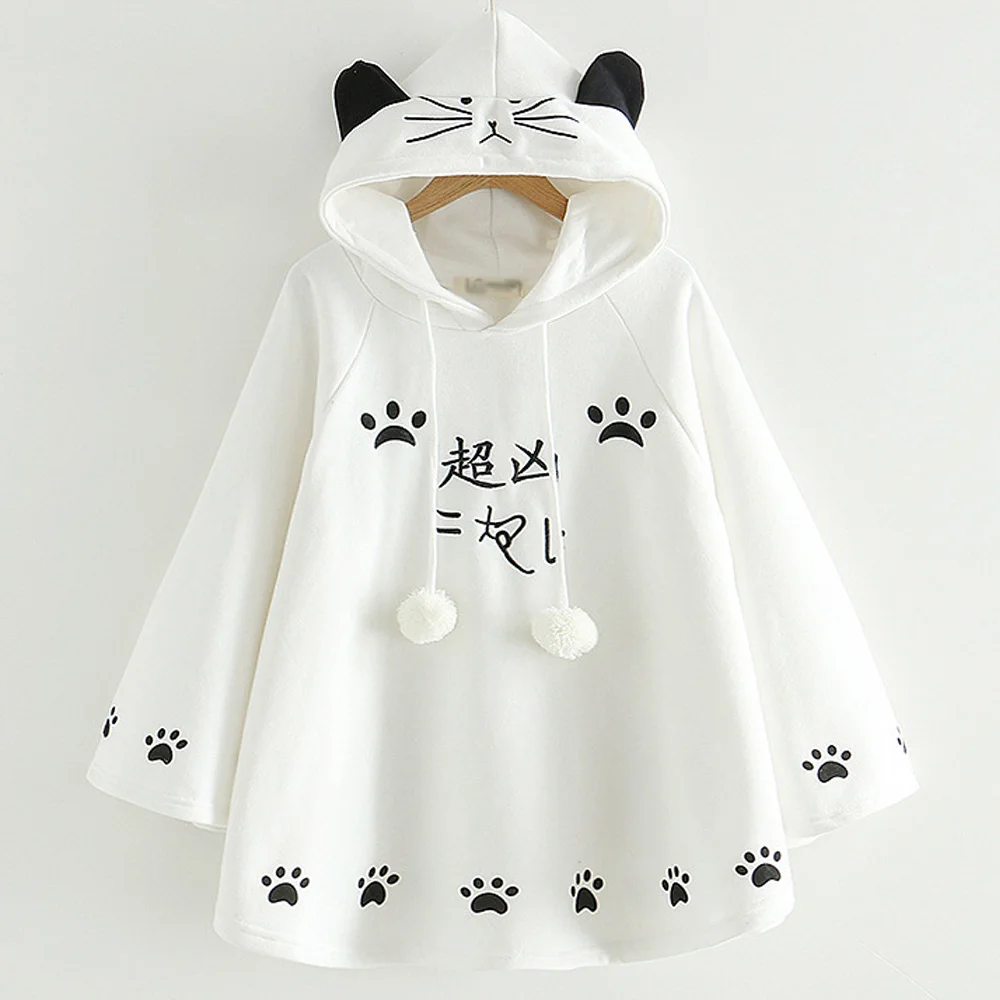 * Описание: кавайная накидка в японском стиле для женщин; Сезон осень-зима; Пончо с капюшоном; Накидка; Пальто с милыми кошачьими ушками; Толстый флисовый пуловер с рукавами «летучая мышь»; Пуловер с рисунком животного; Топы