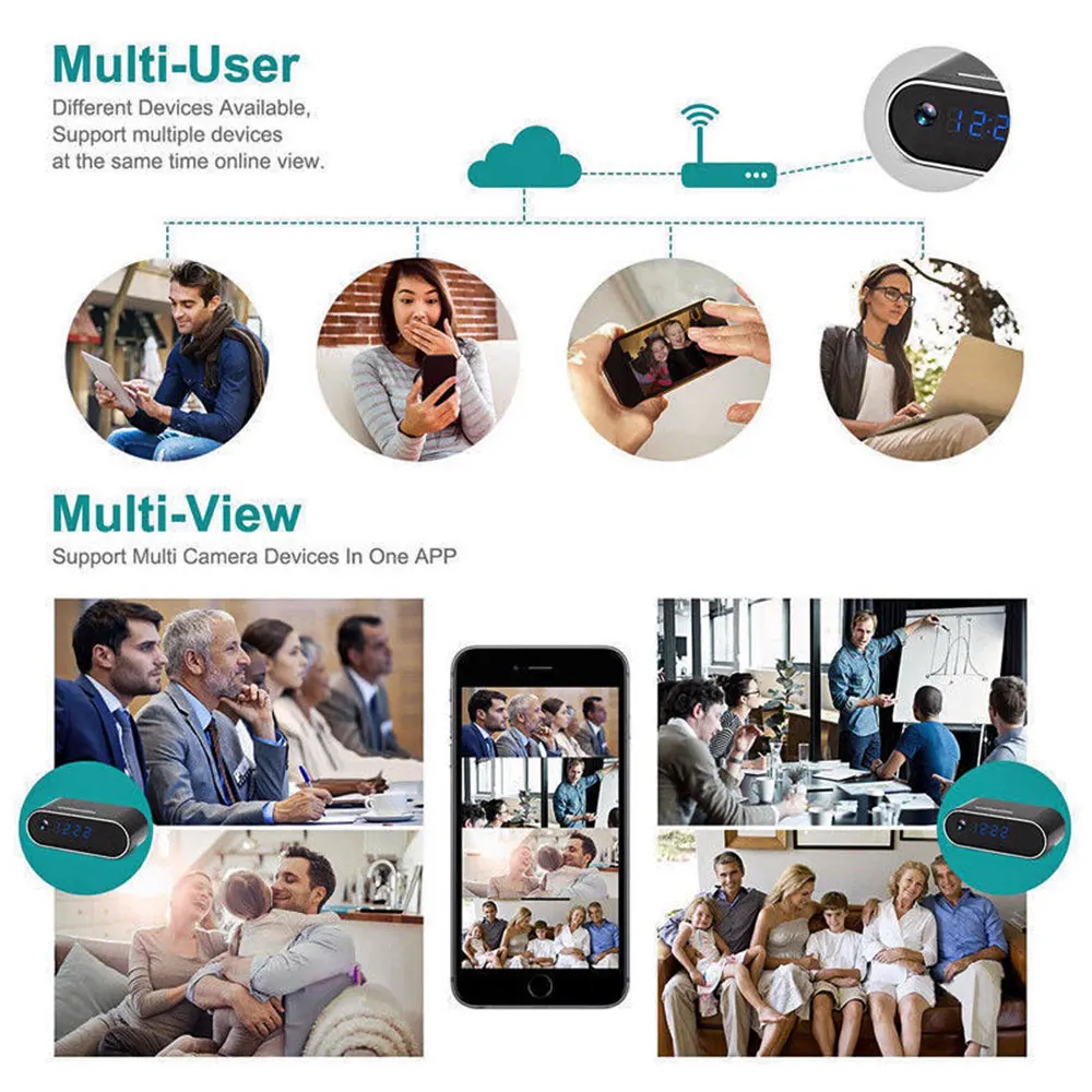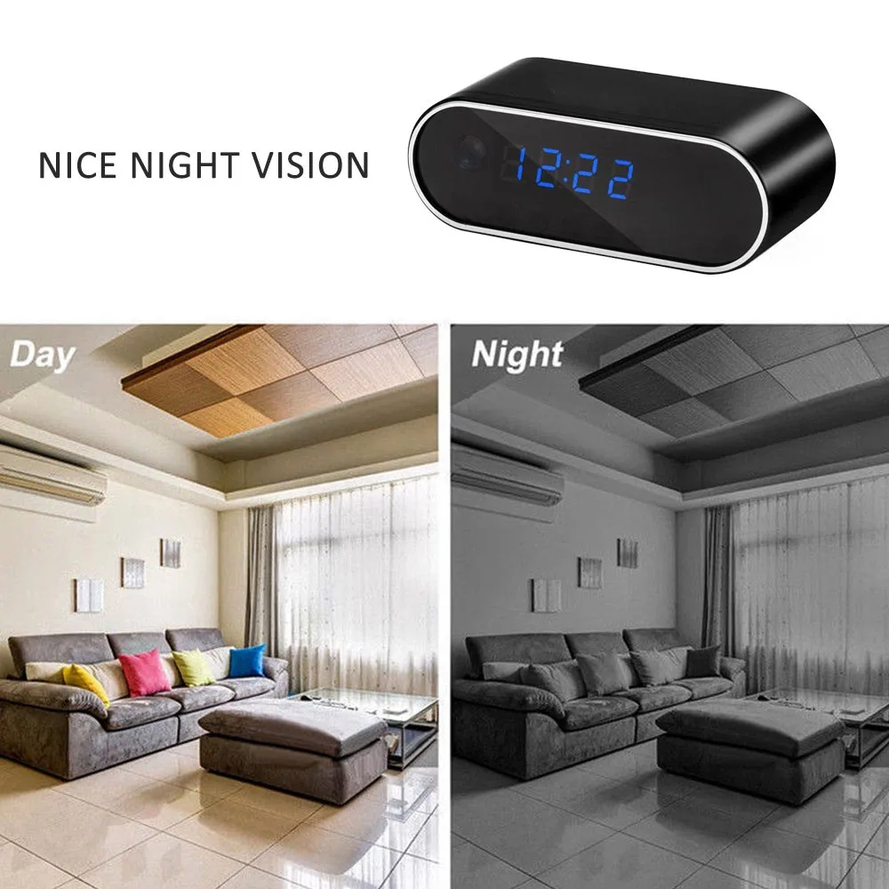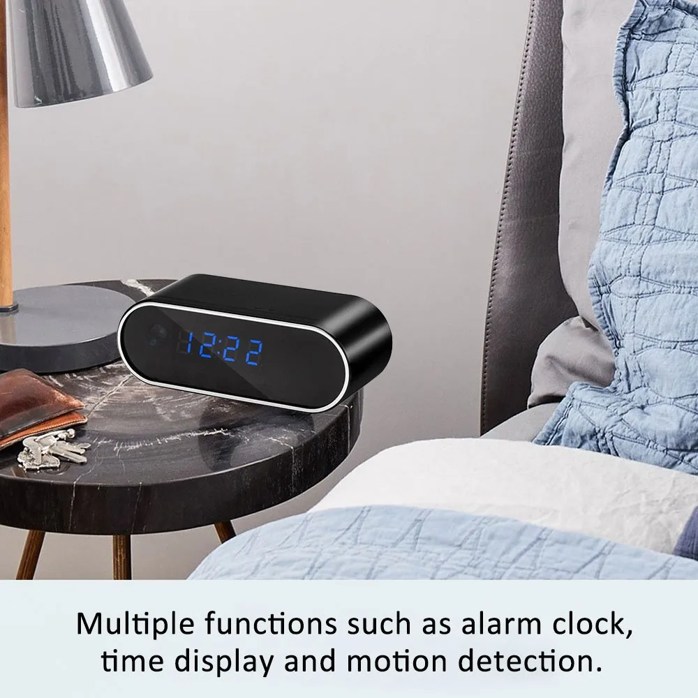 1.[мини-камера в часах]: HD 1080P Wifi камера Будильник Обнаружение движения/циклическая запись домашней камеры наблюдения s 2.[HD App видео в реальном времени]: разрешение видео в реальном времени до 1080P и регулируется до низких уровней, чтобы адаптировать качество Wi-Fi; просто снимайте и записывайте видео на свой смартфон во время просмотра видео в реальном времени для дальнейшего обзора 3.[Удаленный просмотр и воспроизведение видео]: после подключения к сети камеры, можно одновременно поддерживать несколько устройств, удаленное онлайн-просмотр, поддержка приложений IOS и Android 4.[Уведомление об обнаружении движения и оповещении об опасности]: после включения функции обнаружения движения приложение отправит уведомление о тревоге на ваше оборудование мониторинга, когда камера WIFI обнаруживает движение. 5.[циклическая запись]: вставьте карту Micro SD в разъем, включите ее, камера начнет записывать автоматически. Можно вставить карту Micro SD, записать видео и сохранить ее на карту Micro SD, поддерживает карту Micro SD объемом 128 Гб (не входит в комплект); автоматически загружается циклическое видео (24 часа). 6. [режим Wi-Fi Hot Spot] Когда вы включаете камеру и видите мигающий светодиодный индикатор, что означает, что камера излучает сигнал Wi-Fi. Вы найдете устройство в списке возможных подключений WiFi вашего телефона. Вы просто Подключитесь к нему и начнете видеть камеру на своем телефоне! Когда вы подключены таким образом, вы можете просматривать питание на вашем телефоне в пределах 10 метров (33 фута).