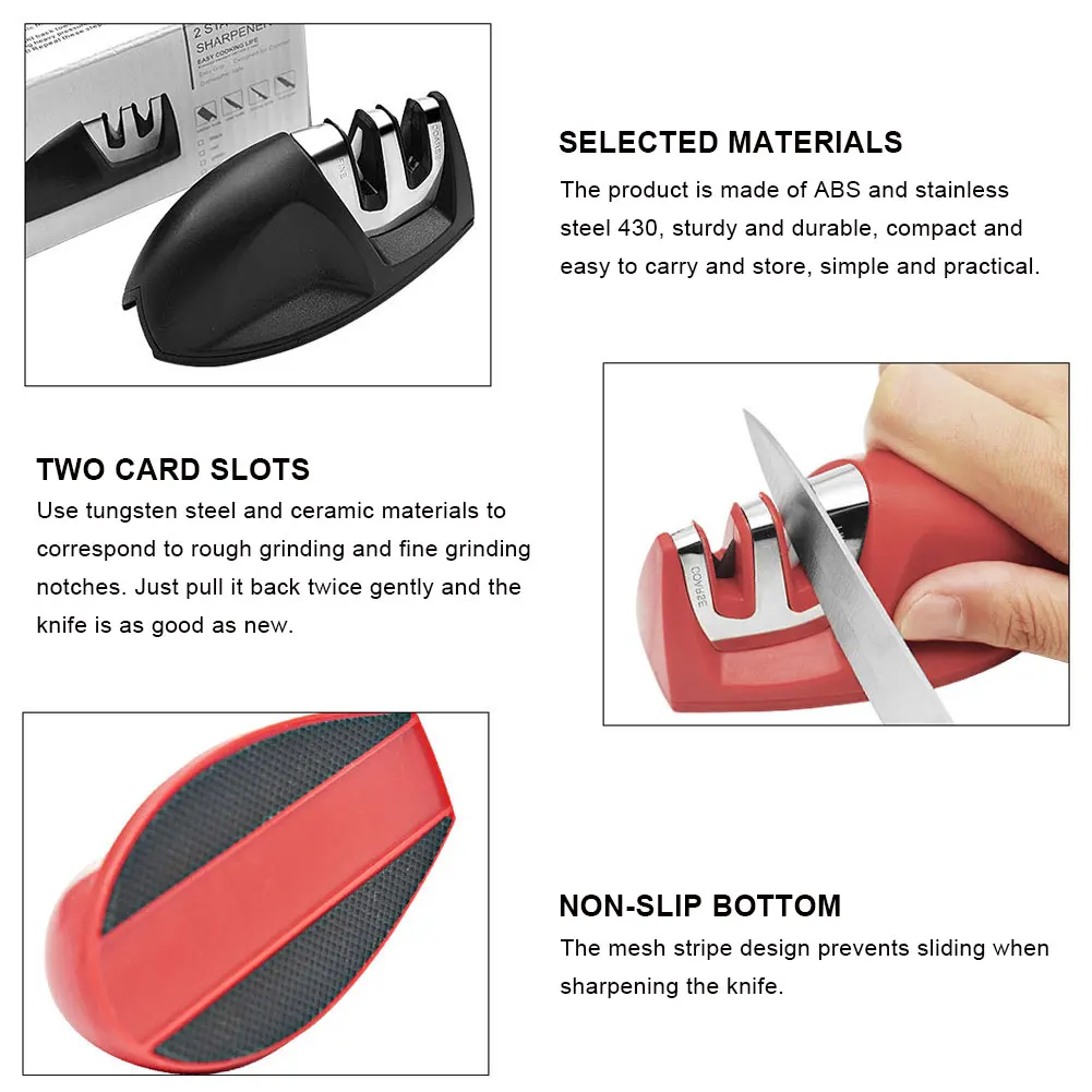 * 4. Уникальный дизайн точит Прямые края двойные Скошенные ножи в Европейском/американском стиле. Два этапа заточки, в одном маленьком компактном блоке по отличной цене! Отверстие для грубой заточки включает твердосплавные лезвия, которые быстро затачивают тусклые или поврежденные ножи с помощью нескольких тяг. Точного слота керамические стержни идеально подходят для отделки и полировки края, а также отлично подходят для светильник прикосновений к уже sharp нож.