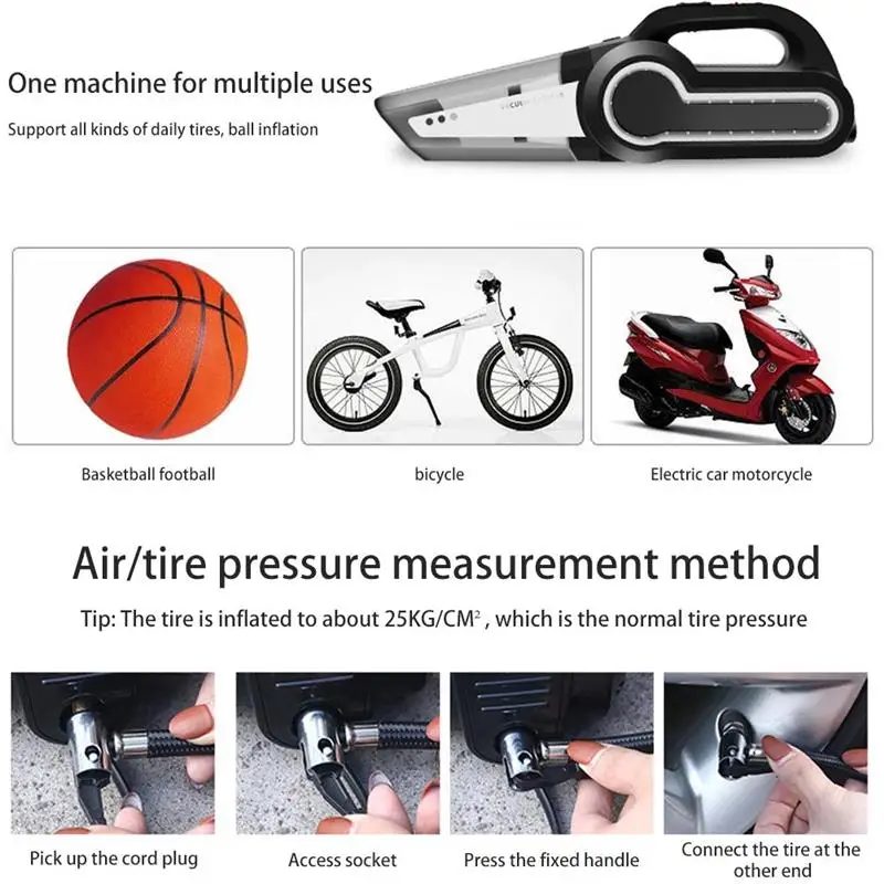 1. Новое обновление 4 в 1 пылесос: отличается от традиционного пылесоса s, Этот пылесос s фокусируется на обслуживании автомобилей. Он имеет 4 функции, включая пылесос + отражатель + датчик давления в шинах + надувной насос. Совмещение четырех функций в одном продукте позволяет избежать проблем с одновременным хранением двух продуктов и является более экономически эффективным, чем покупка двух продуктов.