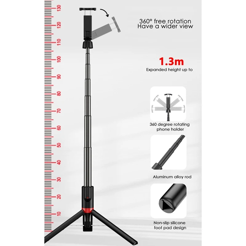 Модернизированный дизайн «Все в одном»: Встроенный штатив, с высококачественным материалом из алюминиевого сплава, прочные нескользящие резиновые ножки обеспечивают большую безопасность и надежность ваших устройств. Отлично подходит для групповых фотографий, Facetime, Adventure Shots, Instagram, Facebook Live, Vlogging. Он также может складываться как обычная селфи-палка, как вам нравится.
