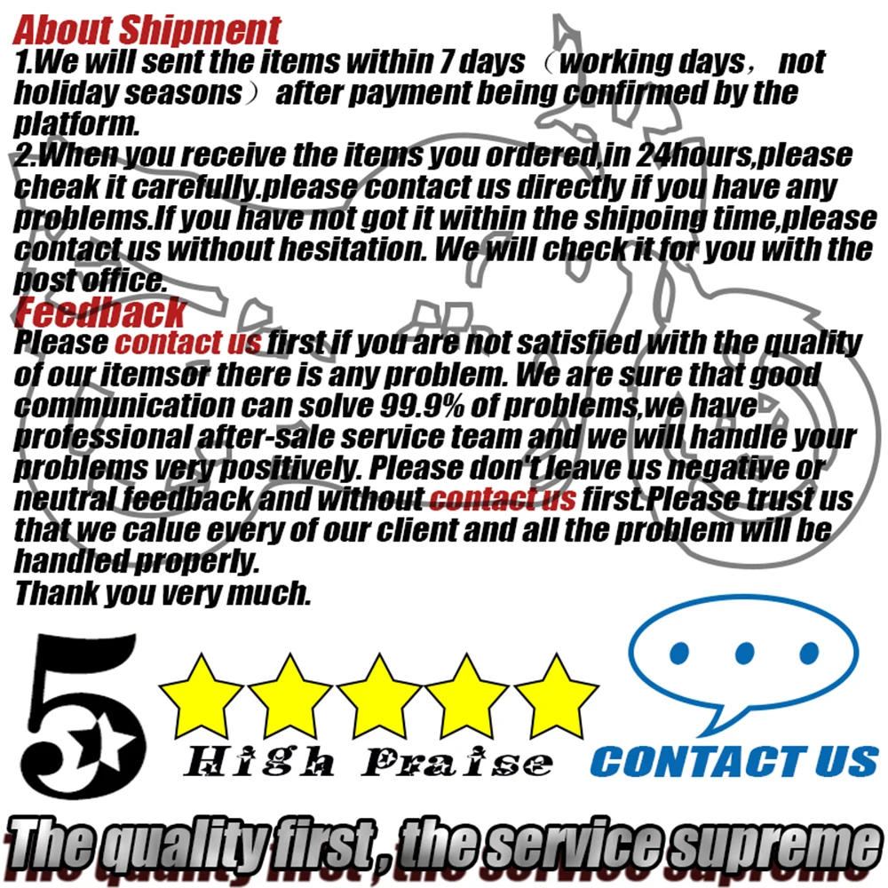 Мы поддерживаем высокие стандарты качества и стремимся к 100% удовлетворенности клиентов! Отзывы покупателей очень важны. Мы просим вас, ПРЕЖДЕ чем оставлять нам нейтральный или отрицательный отзыв, связаться с нами, чтобы мы могли разрешить проблему к общему удовольствию.