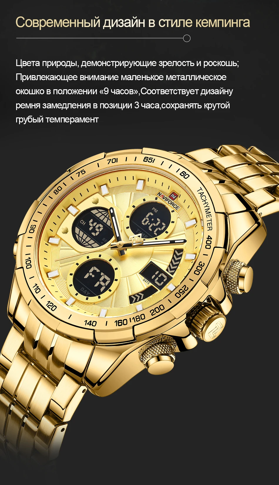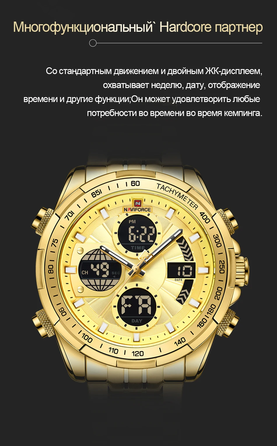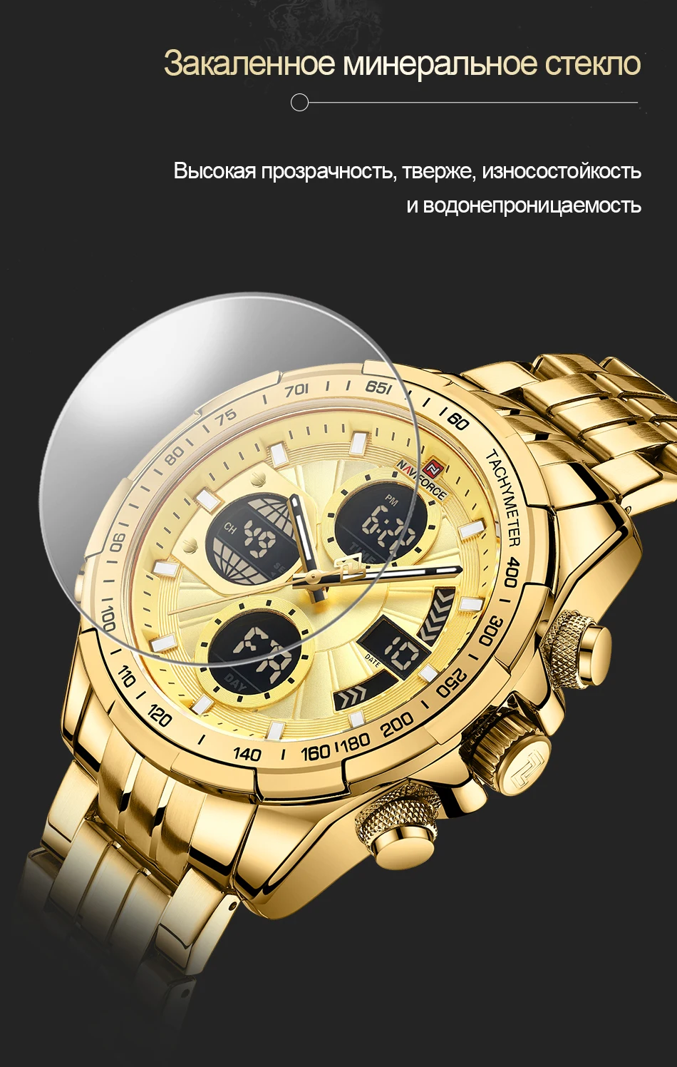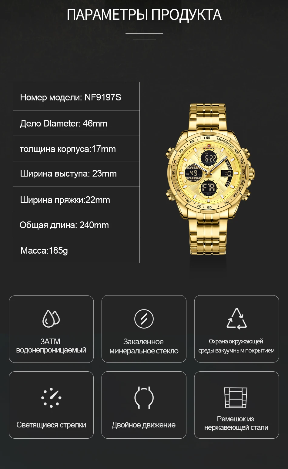 Характеристики: Водонепроницаемость 30 м, отображение дня и даты, светящиеся стрелки