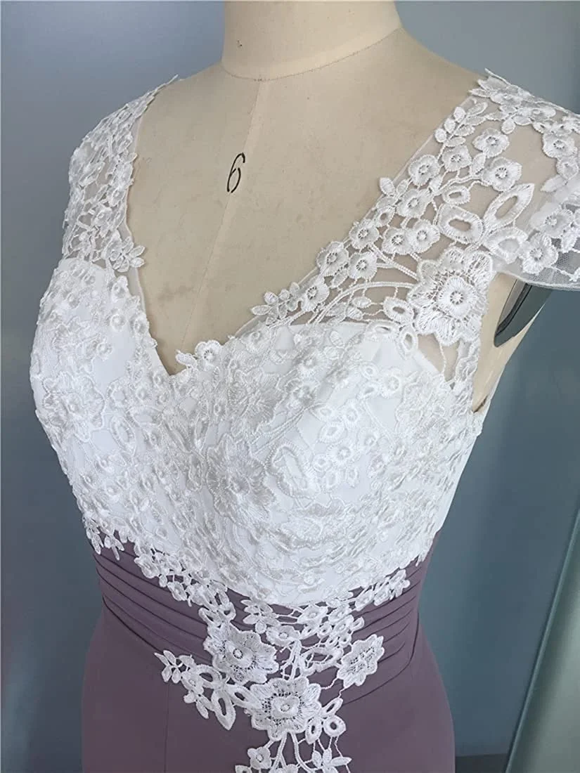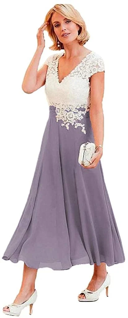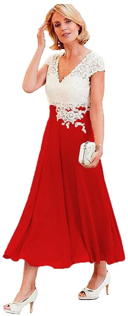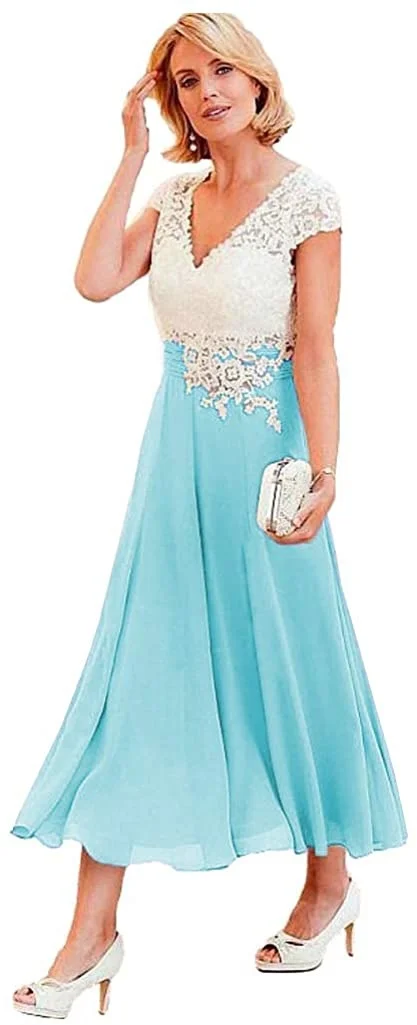 🍀Особенности: чай Длина цвета слоновой кости кружевной топ шифон мать невесты платья для свадеб, линия V шеи вечерние платья, кружева аппликация лиф, естественная талия, встроенный бюстгальтер, платья для матери невесты длиной до середины икры