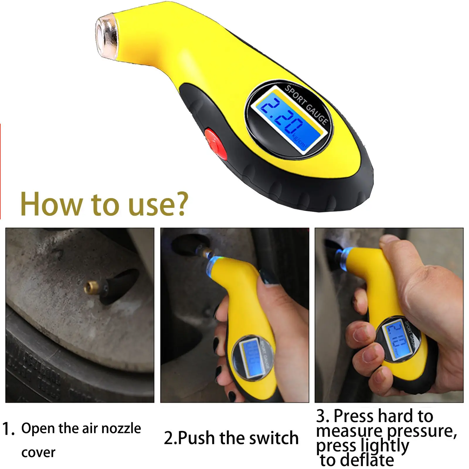 Материал: АБС-Пластик Цвет: желтый аккумулятор: кнопочный аккумулятор LR44 Диапазон давления: 0-100PSI дополнительный блок давления: PSI, бар, кПа, кгс/см2 особенности 1. Легко читаемый ЖК-дисплей с подсветкой 2. Три единицы в наличии: PSI, KPA и BAR. 3. Компактный, легко держать и легко управлять дизайном 4. Высокая точность, быстрое и надежное измерение 5. С нескользящей резиновой рукояткой 6. Ручное включение/выключение и автоматическое отключение для энергосбережения 7. Светодиодная лампа на сопле манометра для удобного использования в ночное время Упаковочный лист: барометр * 1