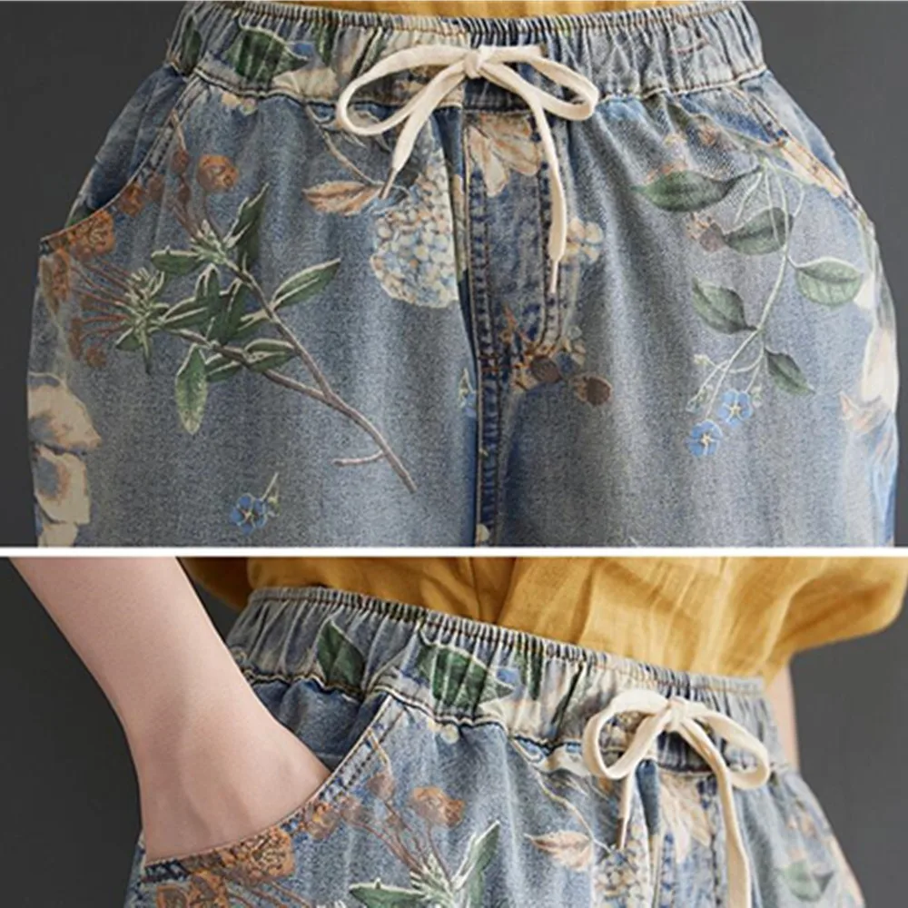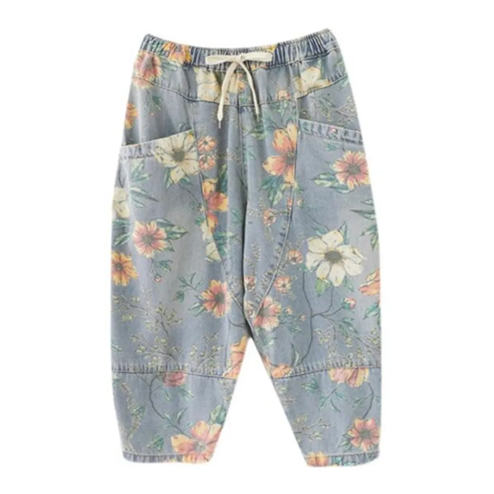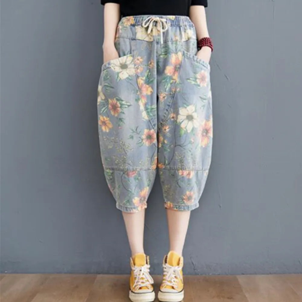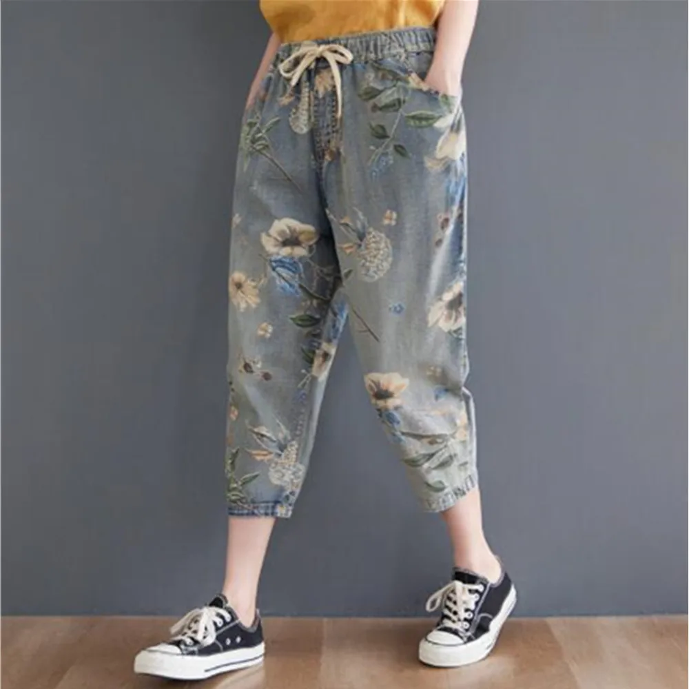 Название: корейские модные мешковатые джинсы для женщин с эластичной резинкой на талии, свободные винтажные джинсовые шаровары с цветочным принтом, Капри, джинсовые брюки для женщин