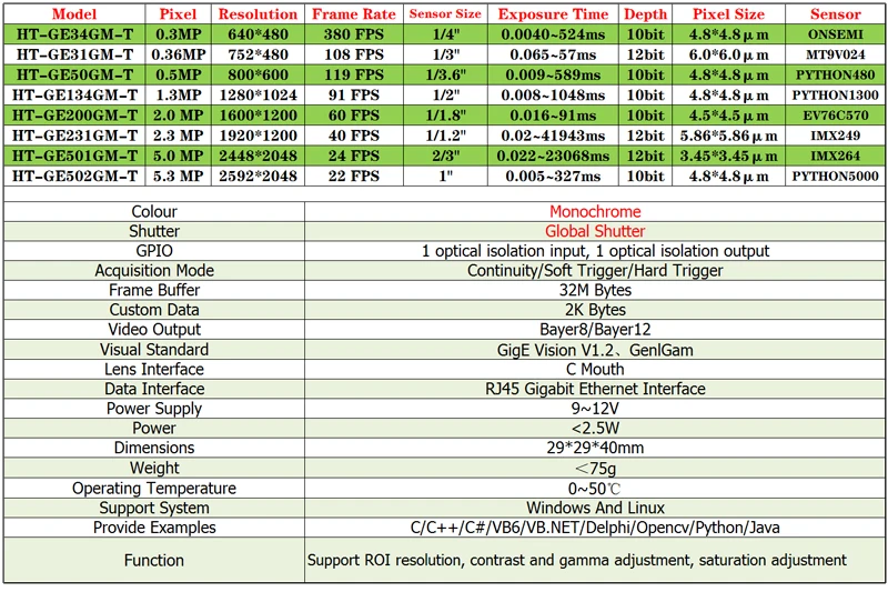 Machine Vision Software:Support Halcon, OpenCV, LabView, Matlab, Python, etc.Industrial Camera Parameters: