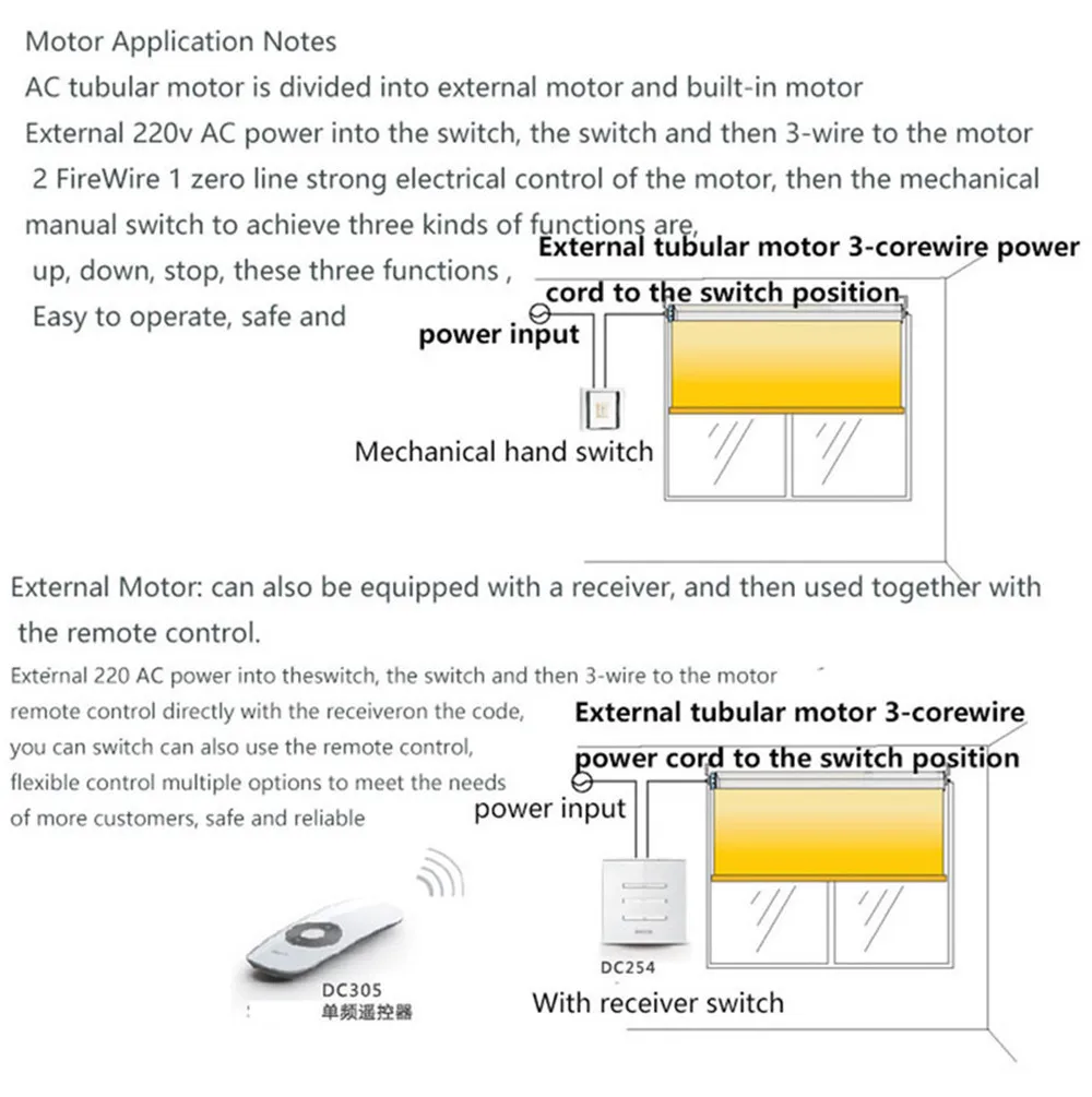 Комплект 2:DM45S 20/15, номинальный крутящий момент-20 нм, скорость прокатки-15 об/мин, 4 провода двигателя без rf433 moudle, он может работать с DC227A,DC228A и Tuya wifi навесной настенный выключатель. DM45S 20/15 + DC227A/DC228A + DC2700/DC2760...., он может управлять через настенный выключатель и пульт дистанционного управления одновременно.