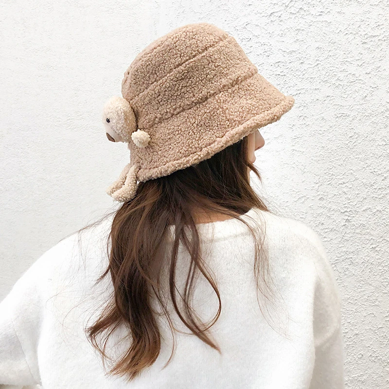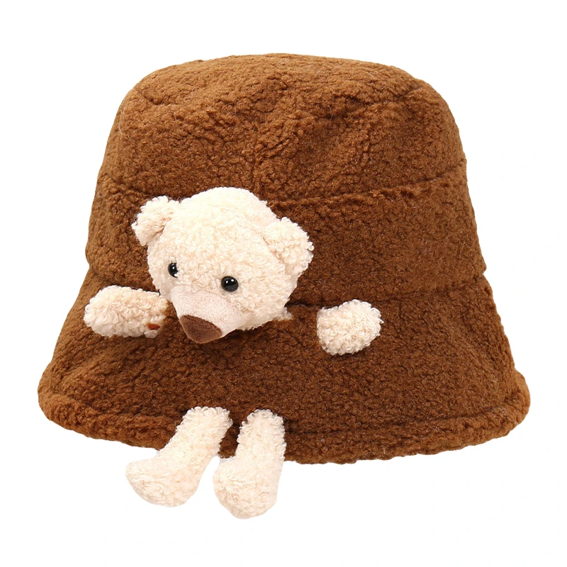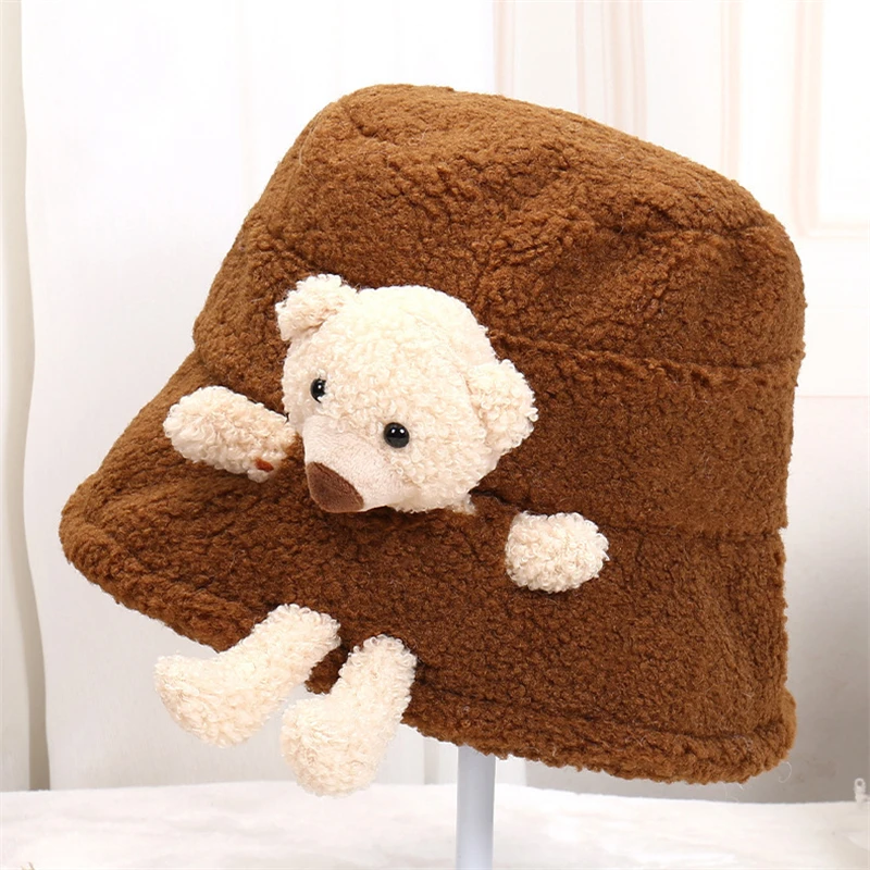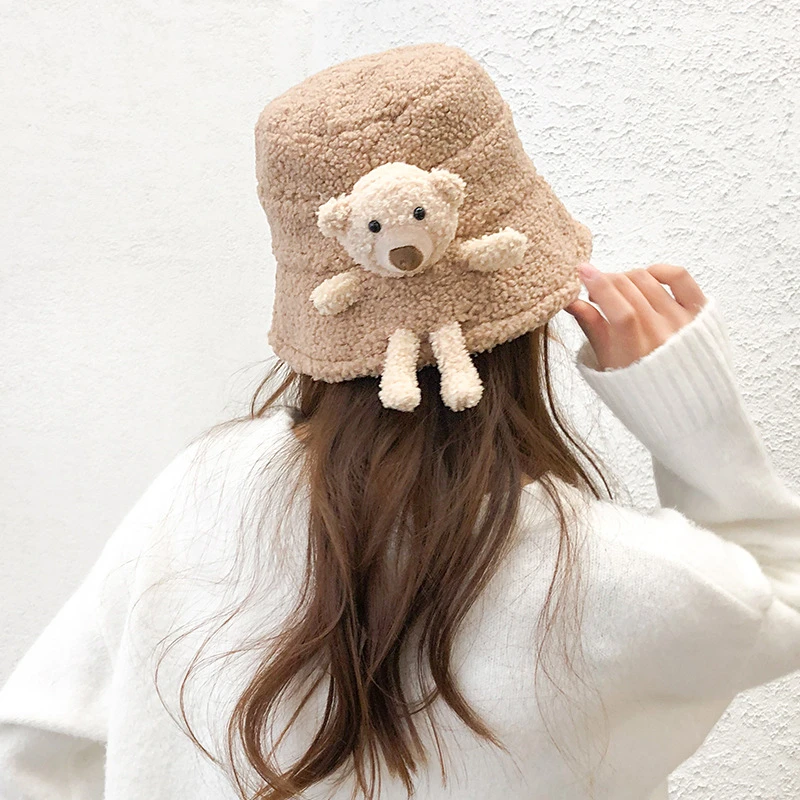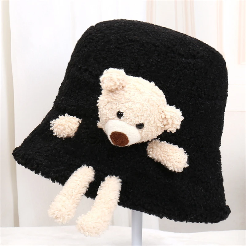 Утолщенная пушистая теплая шапка-ведро, сплошной цвет, милый 3D мультяшный плюшевый мишка украшен.