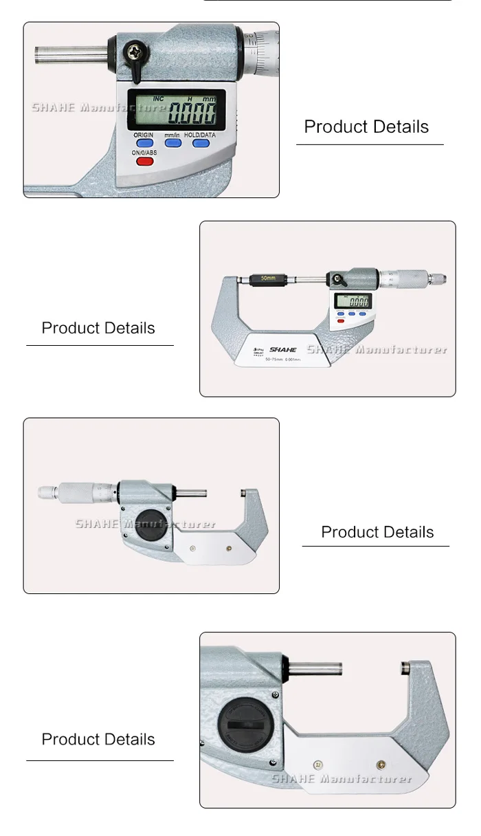 1,4-пуговицы электронный цифровой микрометр 2.IP65 водонепроницаемый 3. С атласно-хромовой шкалой 4. Высококачественный Теплоизоляционный захват. 5. Измерительные поверхности изготовлены из карбида вольфрама. 6. ХРАПОВИК постоянной силы на наперсток. 7. Упакован в пластиковый чехол.