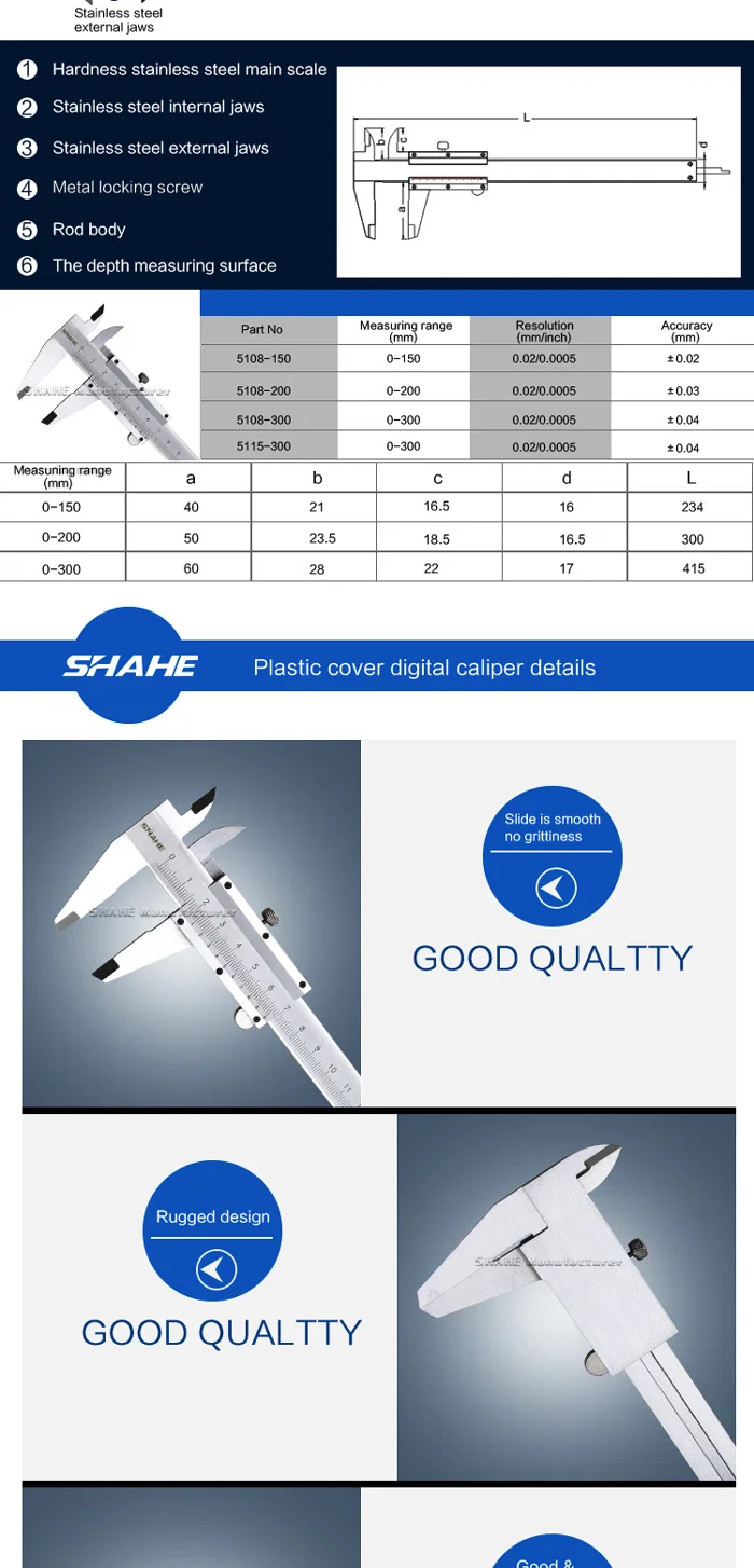 1. Материал-стальная сталь, и все измерительные плоскости закалки, шлифования 2. Точная лазерная градация гарантирует более точное измерение 3. Рулон большого пальца и накатанный запорный винт делают измерение и чтение более удобными 4. С кареткой тонкой регулировки для тонкой подачи слайдера для сверхмощной серии 5. С мостом глубины 6. Измерение для идентификации, OD, глубины и шагов