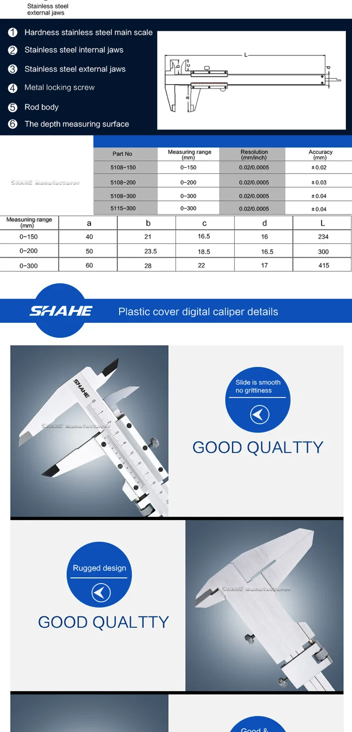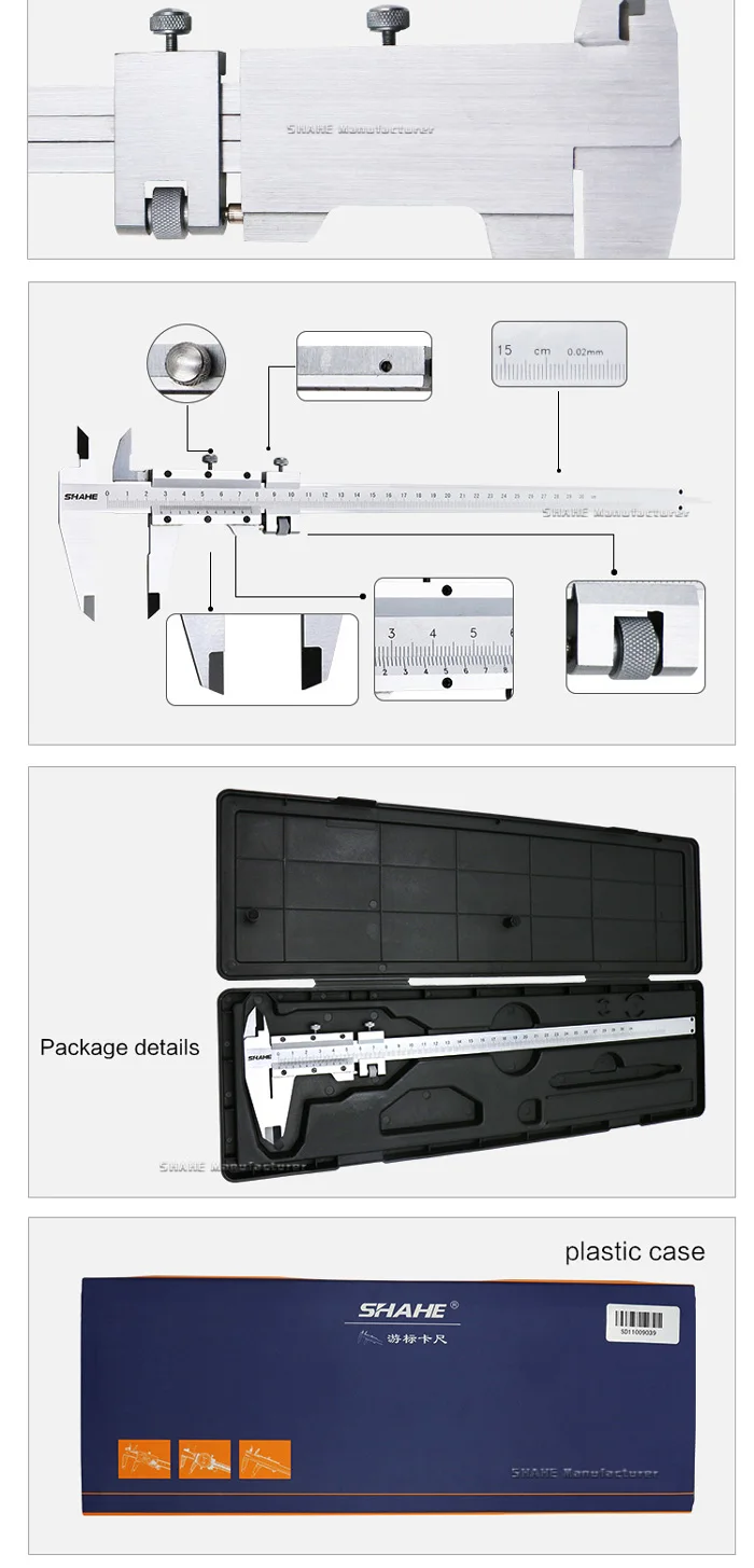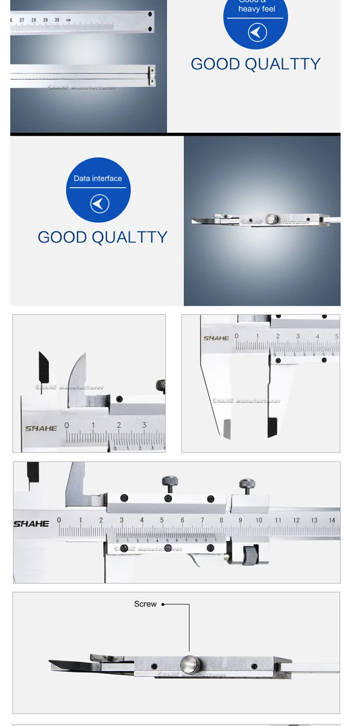 1. Материал-стальная сталь, и все измерительные плоскости закалки, шлифования 2. Точная лазерная градация гарантирует более точное измерение 3. Рулон большого пальца и накатанный запорный винт делают измерение и чтение более удобными 4. С кареткой тонкой регулировки для тонкой подачи слайдера для сверхмощной серии 5. С мостом глубины 6. Измерение для идентификации, OD, глубины и шагов