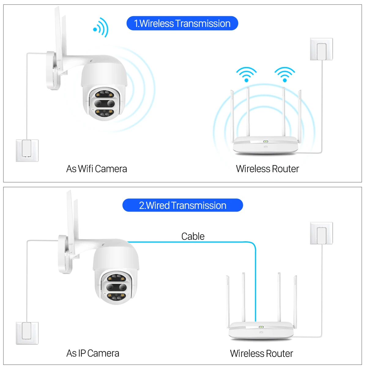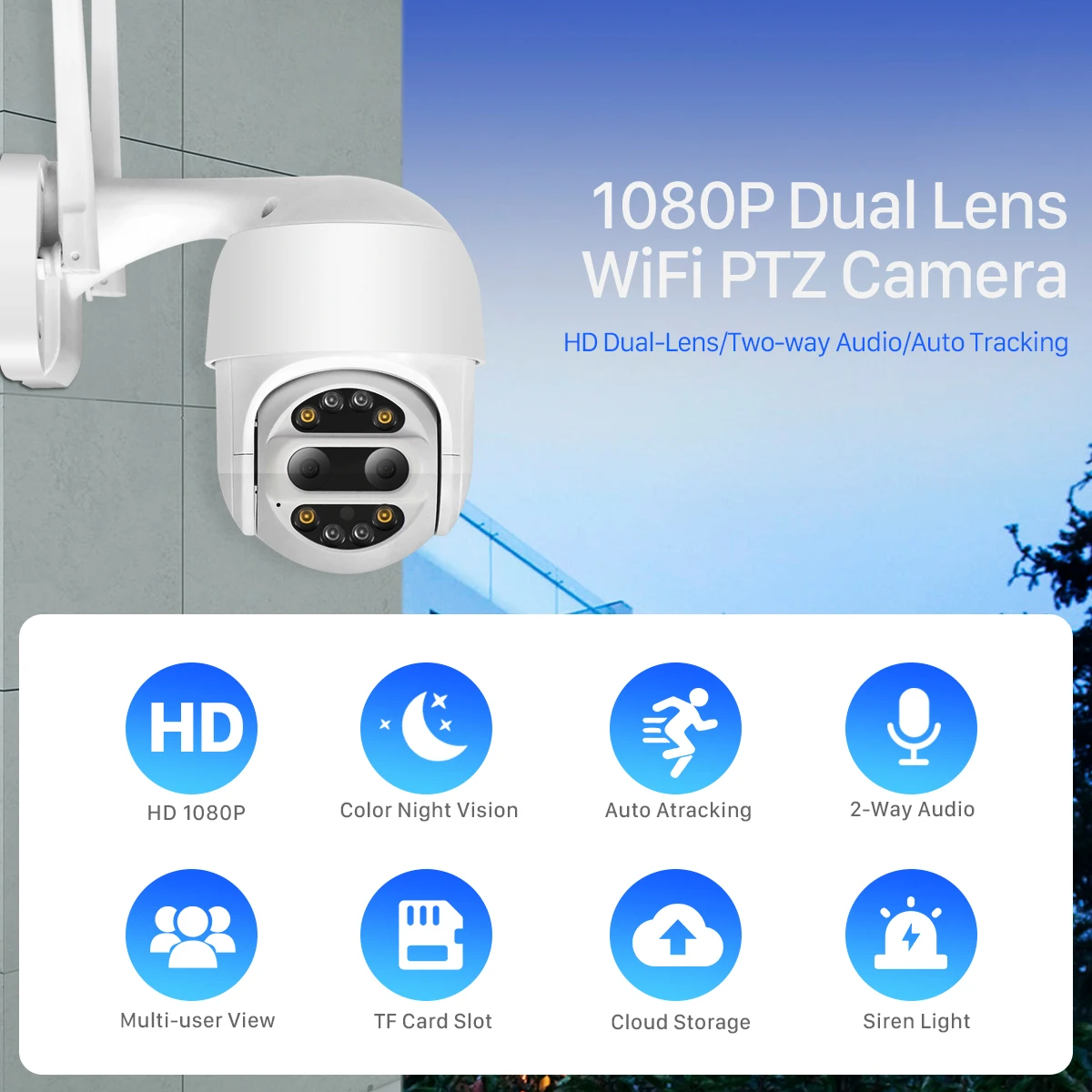 3,6 мм + 12 мм двойной объектив Мгновенно Переключитесь на оптический зум 1.0X 4.0X Интеллигентая (ый) Автоматическое отслеживание Красные и синие огни для Предупреждение светильник 15-45 м красочное/черно-белое ночное видение P2P просмотр через браузер, совместим с Chrome, Firefox, Edge TF карта макс. 128 ГБ и первый месяц бесплатного облачного сервиса. Улучшенная способность проникновения двойной антенны Панорамирование 350 градусов/наклон 90 градусов и 4X зум Беспроводной/Wi-Fi 2,4 ГГц и проводной два режима Двусторонняя аудиовход в режиме реального времени Функция обнаружения движения и сигнала тревоги Протокол ONVIF при подключении через соединение LAN Удаленно просматривайте через приложение YCC365 на смартфоне 1 порт питания, 1 интерфейс RJ45 Ethernet, 10/100 м самоадаптивный; Водонепроницаемый/может использоваться в помещении и на открытом воздухе