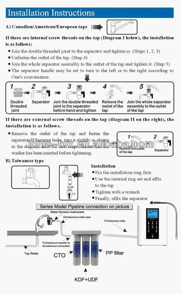 Пожалуйста, внимательно прочитайте инструкции при использовании ионизатора воды и Соблюдайте инструкции во время использования, чтобы избежать повреждения ионизатора или повлиять на здоровье вашей семьи. A) не используйте воду из колодца или подземную воду, которая является мутной или может быть загрязнена тяжелым металлом. B) не подключайте ионизатор к источнику горячей воды и не допускайте попадания воды более 40 градусов. Цельсия проходит через него. Избегайте высоких температур и держите подальше от прямых солнечных лучей. C) Не мойте корпус напрямую и Избегайте использования спирта или других летучих растворителей для очистки корпуса. Используйте мягкую ткань или кусок ткани, смоченный в мыльной воде, чтобы слегка очистить его. D) Регулярно очищайте датчик, чтобы избежать закупорки, в результате чего машина не работает должным образом.Обратная связь