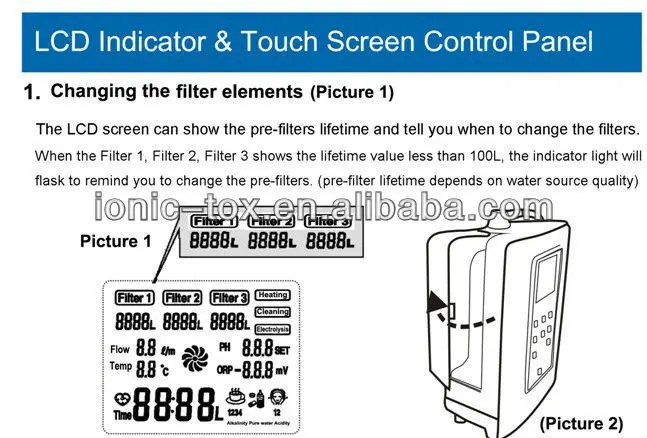 7. ЖК-дисплей сообщает: температура воды, время, объем потока воды, электролизинг, очистка, срок службы картриджа фильтра, значение pH O. R. P индикатор и т. Д.