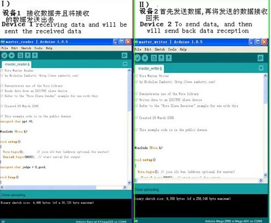 Адрес MCU и отправка модуля передачи данных, каждый может отправлять только один байт данных и генерирует стоп-бит. Если модуль занят, вам нужно повторно отправитьПримечание: Когда модуль не работает, когда хост считывает данные, результаты всегда считываются 0x47При получении данных в MCU необходимо отфильтровать 0x47 (десятичный 71), иначе программа пойдет не такКоммуникационные эксперименты с использованием модуля:Экспериментальные условия:Беспроводной модуль два, arduino 328, arduino ADK.