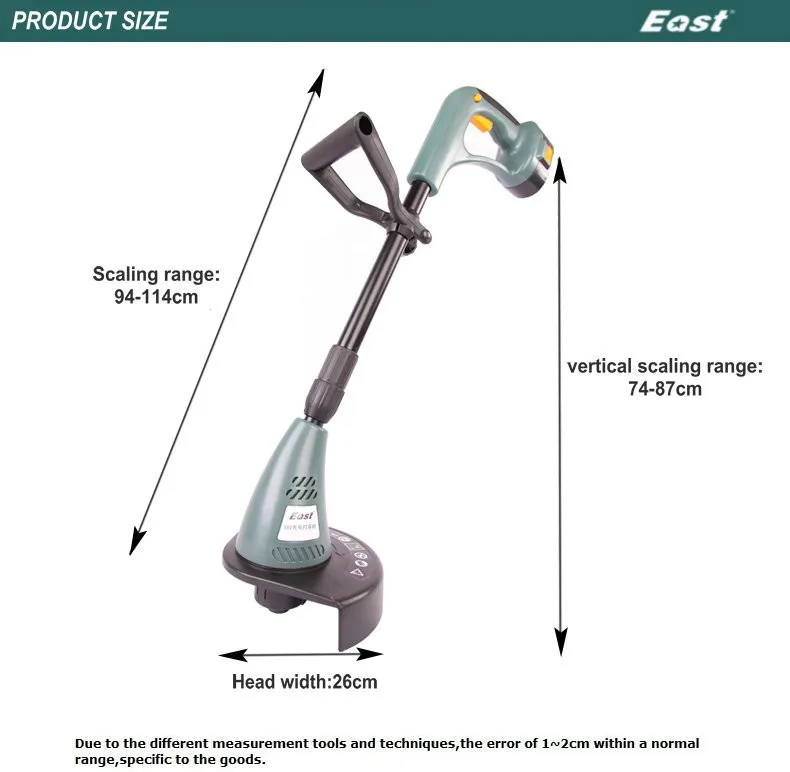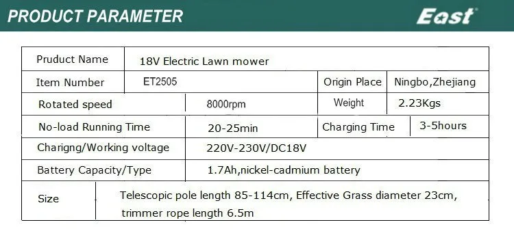 Напряжение аккумуляторной батареи: 18 В постоянного тока Аккумулятор: 1300mA.h,Ni-cd Без скорости нагрузки: 8000 об/мин, Траектория резки: 230 мм, Время зарядки: 5 часов Катушка: 6,5 м, 1,6 1,6 мм Телескопическая ручка: алюминий (850-1140 мм)