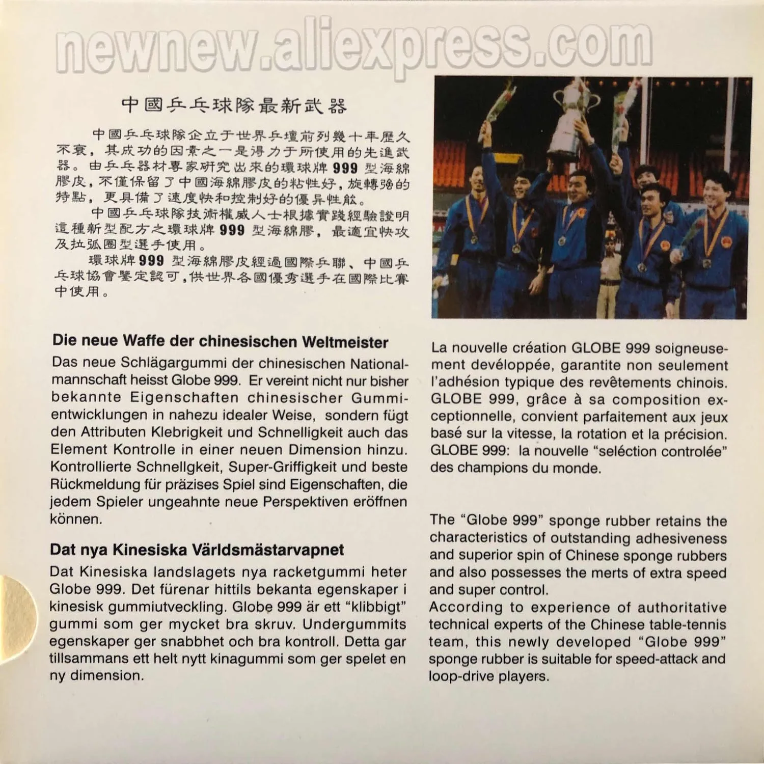 Губчатая Резина «Globe 999» сохраняет характеристики отличной адгезии и превосходного вращения китайских губчатых каучуков, а также обладает мертами повышенной скорости и супер-контроля. Согласно опыту авторитетных технических специалистов китайской команды по настольному теннису, эта недавно разработанная губчатая резина «Globe 999» подходит для игроков со скоростью атаки и циклическим приводом. Скорость: 9 Вращение: 9 Контроль: 9 Толщина губки: 2,2 мм/2,0 мм/1,8 мм/1,5 мм/1,2 мм/1,0 мм Цена указана только за одну резинку с губкой.