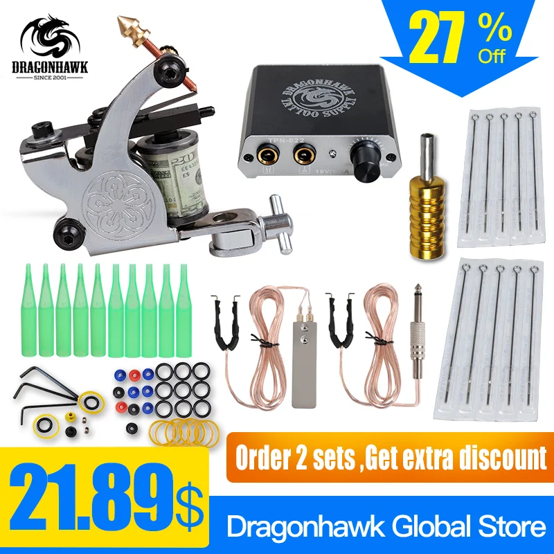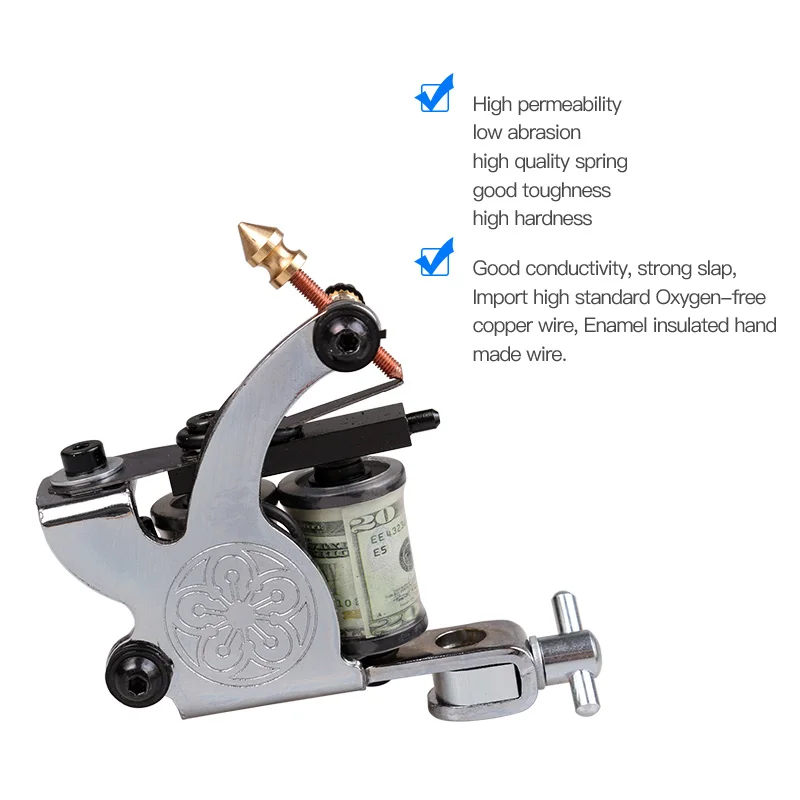 1 шт. тату-машина, 10 катушек для обертывания, можно установить как для подкладки, так и для затенения, рабочее напряжение при напряжении 7-10 В, частота: 120-150 Гц, один год гарантии.