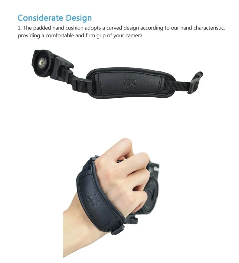 JJC HS-M1 предназначен для зеркальных и беззеркальных камер. Это гарантирует вам твердое понимание вашей камеры во время съемки. Внешний ремешок изготовлен из высококачественной искусственной кожи из микрофибры. Мягкая подушка для рук удобна и обеспечивает поддержку при появлении снимка и тем самым помогает избежать усталости рук при съемке в течение длительного периода времени. Кроме того, он очень просты в установке и снять. Один конец ручного ремня крепится к камере, Прикрепив его пластиковую пластину с винтом 1/4-20 для большого пальца к гнезду штатива камеры. Другой конец подключается к петельке камеры и крепится к задней застежке. Вместо того, чтобы иметь камеру, свисающую с длинного ремешка, эта рукоятка надежно удерживает камеру в руке, поэтому, когда вы готовы к съемке, все, что вам нужно сделать, это поднять камеру на уровень глаз и снимать.