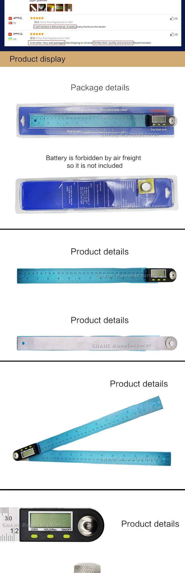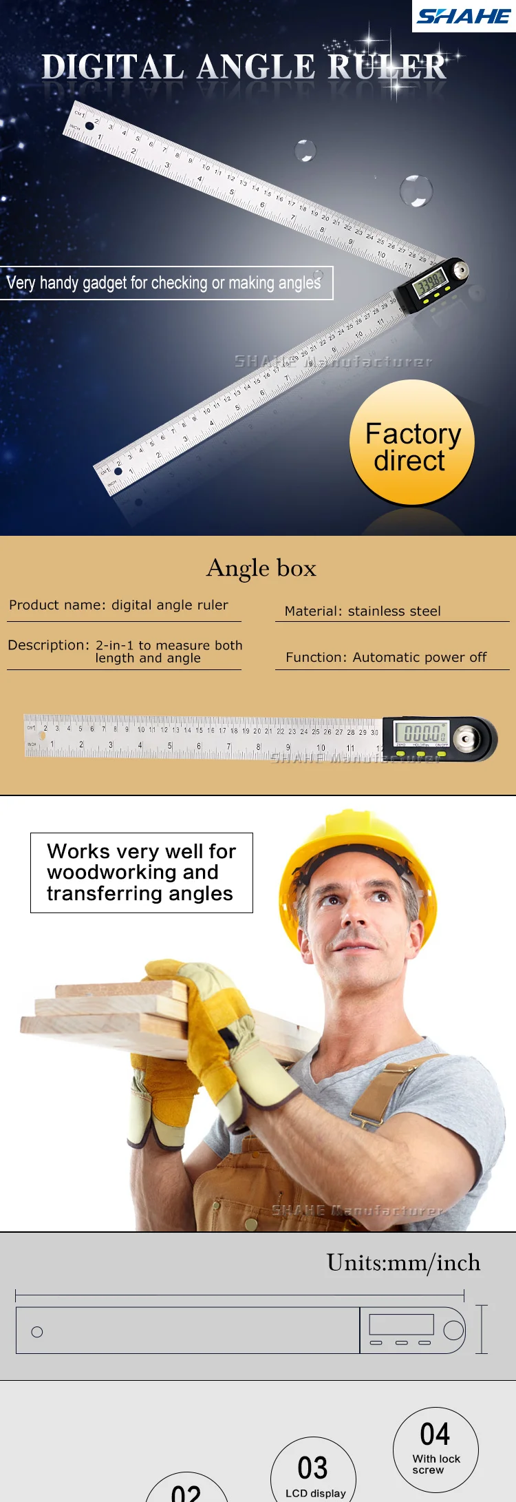 1,2 в 1 для измерения легота и угла 2. Легко работать с тремя функциональными клавишами 3. Шкала из нержавеющей стали обеспечивает долговечность 4. Измерение внутреннего и внешнего угла 5. Быстрое отображение измеренного значения на большом ЖК-экране 6. Крепежный винт для закрепления угла измерения в любом положении 7. Измерьте угол и длину, метрический и дюймовый дисплей. 8. Компактная структура для удобного ношения и использования 9. Ослабление чертежной линии линейкой из нержавеющей стали 10. Его можно использовать в различных областях, а не в прямой линейке, квадратной и т. д.