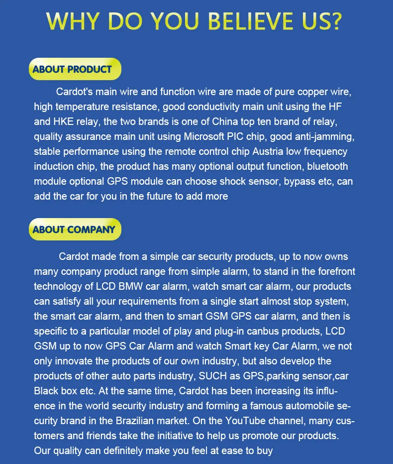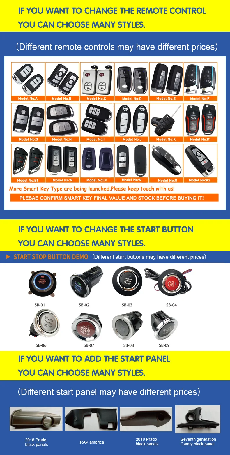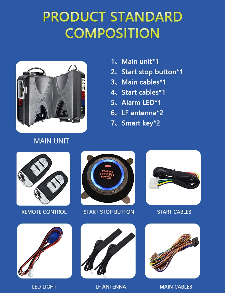 Автомобильная сигнализация детали -Основные функции 1.Система входа без ключа 2. Толчок старта стоп двигатель 3. Двигатель дистанционного запуска 4. Боковая дверь сигнализации триггера 5. Удаленный открытый багажник 6. Удаленный поиск автомобиля 7. Сигнализация запуска Illeage 8. Умная защита от угона 9. Режим отключения звука 10. Автоматизация центрального замка (не отключается) 11. Вспышка открытой двери (не отключается)Продукт стандартный состав 1. Основной блок * 1 2. Кнопка Start stop * 1 3. Основные кабели * 1 4. Пусковые кабели * 1 5. СВЕТОДИОДНАЯ Сигнализация * 1 6. НЧ антенна * 2 7. Смарт-ключ * 2