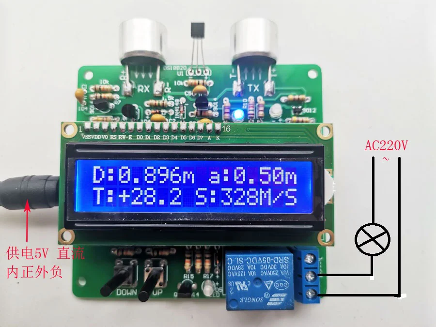 Описание функции: Измерьте расстояние плоскости 3-200 см, вы можете установить расстояние тревоги, когда измеренное расстояние меньше установленного расстояния тревоги, реле будет действовать. На ЖК-экране отображается измеренное расстояние, расстояние сигнализации, текущая температура и текущая скорость звуковых волн.