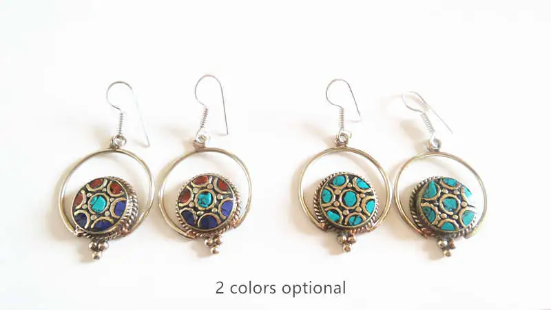 Тибетские этнические серьги медные инкрустированные бирюзовые винтажные двойные круглые серьги