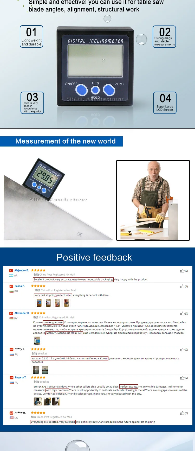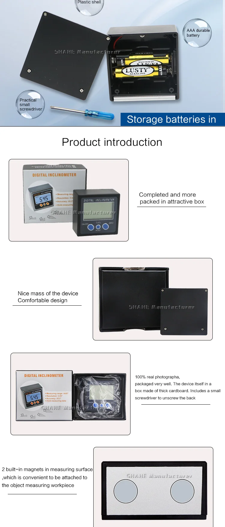 1. Пластиковый материал светильник и прочный) 2. Диапазон измерения 0-90 ° * 4 3. Три функциональных клавиши 4. С функцией хранения данных 5. Установка нуля в любом положении 6. Быстрое отображение измеренного значения на большом ЖК-экране 7. С переключателем питания ВКЛ-ВЫКЛ и автоматическим выключением на выбор 8. С 2 встроенными магнитами для удобного прикрепления к измериемому Железному предмету 9. Двустороннее считывание, позволяющее считывать отображение справа вверх 10. Обмена относительно-абсолютным измерением в любом положении, функция ABS 11. Используется для измерения угла в автомобиле, деревообработке, строительстве, буровой технике и т. д.