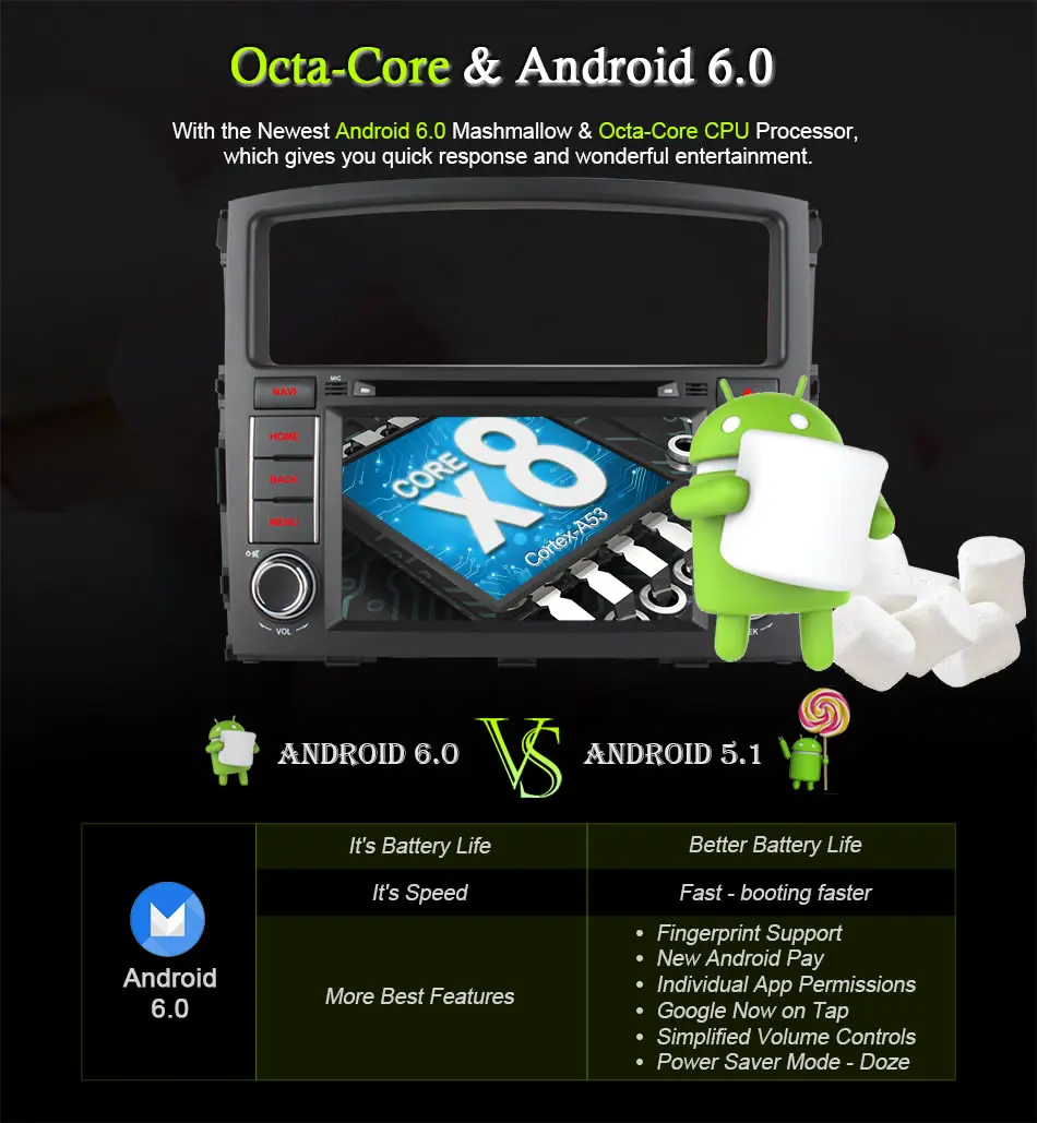 Общая информация Операционная система Android 6,0(64-бит) Вариант 1: MT3562 ВосьмиядерныйСердечник, РукаCortex-A53,1,3-1,6 ГГц,DDR32 Гб ,Встроенный32ГБ Вариант 2: MT3561 ЧетырехъядерныйЯдро,РукаCortex-A53,1,3-1,6 ГГц,DDR32 Гб ,Встроенный16 Гб Языки меню (OSD) Русский, английский, китайский, испанский, португальский, итальянский, французский, голландский, турецкий, шведский, норвежский, польский, японский, корейский, малайский, индонезийский (более 60 видов) Стандартные характеристики Встроенный 4G + GPS Navi + FM/AM радио + Bluetooth + Мультимедиа + USB + AUX + WiFi, поддержка Mirrorring Дополнительный доступ DAB + тюнер; TPMS; DVR; OBD II; DTV Box(DVB-T2/MPEG4/ISDB-T); RearCamera; Микрофон... Дисплей Дисплей Цифровой TFT ЖК-монитор 16:9 Разрешение 1024*600 Сенсорный экран Емкостный сенсорный экран Интернет WiFi Встроенный WiFi, 802.11b/g/n, совместимый WLAN 4G Встроенный модуль 4G (непосредственно вставьте sim-карту) GPS Чип GPS ANT Mediatek MT6625 Хранилище карт Встроенная вспышка или sd-карта Карты Поддержка iGo, Navitel,Tomtom, Sygic, Google map online и т. Д. DVD, если применимо Тип Диска Диск 12 см Совместимый диск DVD-видео, DVD-аудио, DVD ± R/RW, DVD-ROM; CD-DA, CD-R, CD-RW; Видео CD, DVCD Забрать HOP-1200XH (HITACHI) Мультимедиа Воспроизведение видео 1080P Поддержка USB 3 порта USB; Формат видео Avi, mkv, mov, mp4, mpeg, mpg, rmvb, flv, H.265 и т. Д. Формат аудио MP3, WMA, AAC, RM, FLAC и т. Д. Фото JPG, BMP, JEPG, GIF, PNG и т. Д. Радио Частота FM/AM FM: 65 МГц74 МГц; 87,5 МГц108 МГц; AM:522 кГц1710 кГц Предустановочные станции FM 3*6; AM 2*6 RDS Поддержка Радио IC TEF6686 (получите очень стабильный и лучший сигнал) Bluetooth Bluetooth Ver. Bluetooth V4.0, поддержка A2DP, Bluetooth IC MT6625 Телефонная книга Поддержка Микрофон Встроенный (внешняя поддержка) Управление файлами Основные функции Поддержка загрузки, установки и удаления более тысячи приложений android Официальное программное обеспечение Поддержка чтения и редактирования Word/Excel/Powerpoint/PDF/TXT Коммуникационные инструменты Skype, Gmail, Twitter, Facebook, VK и т. Д. 3D игры Поддержка Технические характеристики оборудования Рабочее напряжение DC + 10,8 V -- 14,4 V Максимальная выходная мощность 4*45W AMP IC TDA 7851L (4*45 Вт MOSFET квад-мост усилитель мощности-лучшее качество звука) Рабочая температура/температура хранения. -20°-- + 70°/ -40°-- + 80°