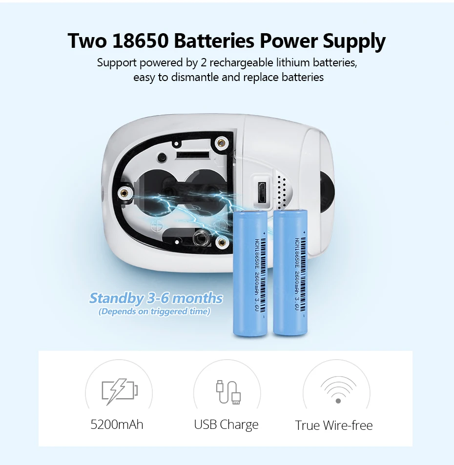 Наша ip-камера KERUI поддерживает Питание от 2 аккумуляторов стандарта 18650, легко демонтировать и заменить батареи. (2*18650 батареи могут использоваться в течение 2-6 месяцев)