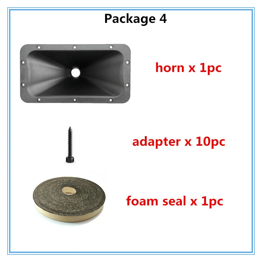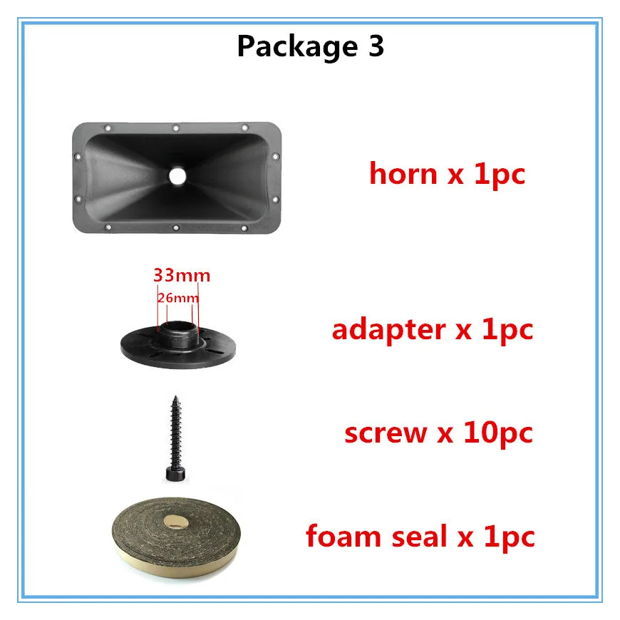 4 упаковочных комплектах на выбор, детские леггинсы Посылка 1 = 2 шт. Рог + 20 шт. винты + 1 шт. пенопластовое уплотнение Посылка 2 = 2 шт. Рог + 2 шт. адаптеров + 20 шт. винт + 1 шт. пенопластовое уплотнение Посылка 3 = 1 шт. Рог + 1 шт. адаптер + 10 шт. винт + 1 шт. пенопластовое уплотнение Посылка 4 = 1 шт. Рог + 10 шт. винт + 1 шт. пенопластовое уплотнение Описание продукта: Громкоговоритель твитер Рог Монтажное применение для компрессионного драйвера HF Модель JB3010 Размер WxDxH 302x162x110 мм Горло 1 дюйм Материал из АБС-пластика Цвет черный