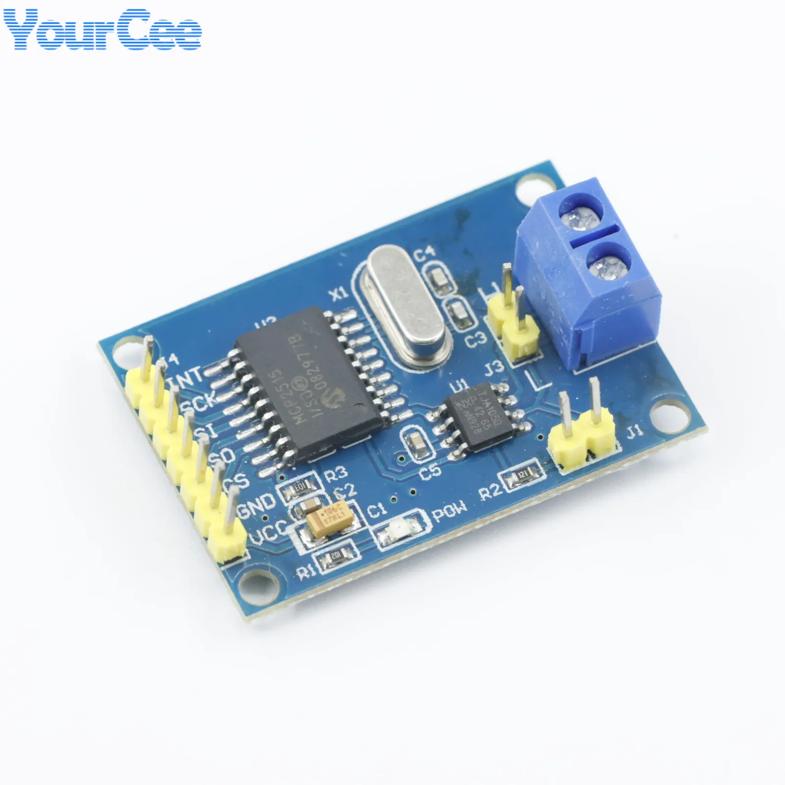 MCP2515 плата модуля CAN-шины TJA1050 приемник SPI для 51 MCU контроллер рычагаОсобенности:Это новый модуль шины CAN MCP2515 TJA1050, приемник, протокол SPIСовместимость с проектами на базе микроконтроллеров Arduino. Характеристики:Поддерживает спецификацию CAN V2.0B, скорость связи 1 МБ/с.Поле данных от 0 до 8 байтТри рамки-стандартные, разверните рамку и пультМодуль питания DC5V и протокол контроля интерфейса SPIОконечные резисторы 120 Ом, сопротивление, обеспечивает пропускную способность, передачу данных на большие расстояния от сигнального излученияРазмеры модуля 4. 4 х 2,8 см/1,57*1,1 "(прибл.)Рабочий ток-тип. 5 мА и 1 мкА ток в режиме ожиданияРабочая температура-(промышленный класс) -40 °C - + 85 °C