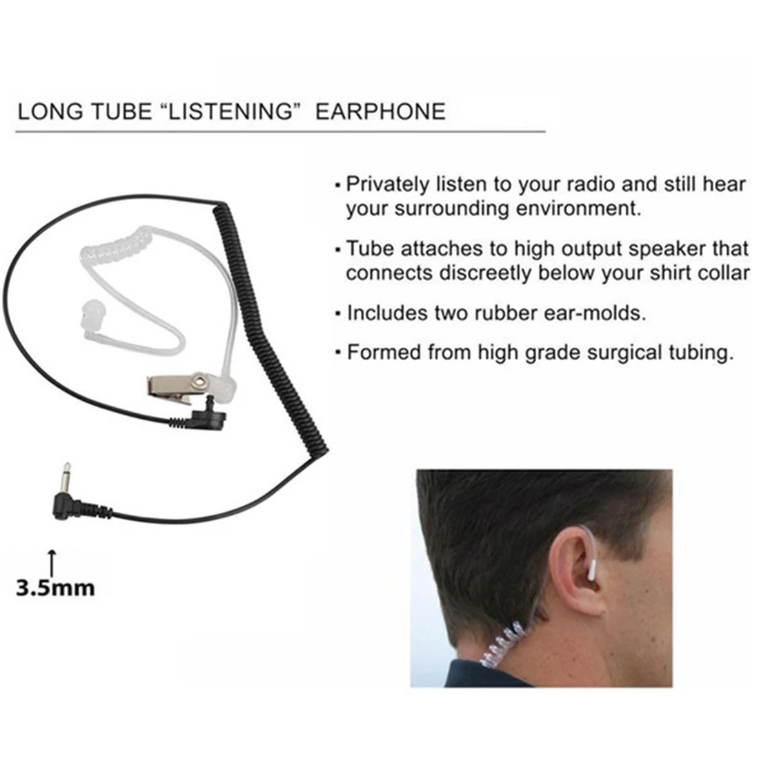 2. Мягкий силиконовый ушной бутон, плотно прилегающий к уху, с прозрачной акустической трубкой.