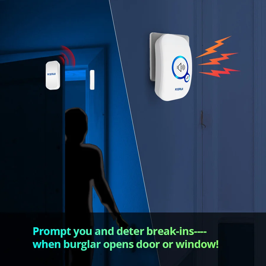 Установите датчик двери на дверь или окно. Когда кто-то нажимает, откройте дверь и окно, дверной звонок получает сигнал и сразу начнет оповещать. Дверной датчик Питание: 1 шт 12V 23A батарея (не входит в комплект)
